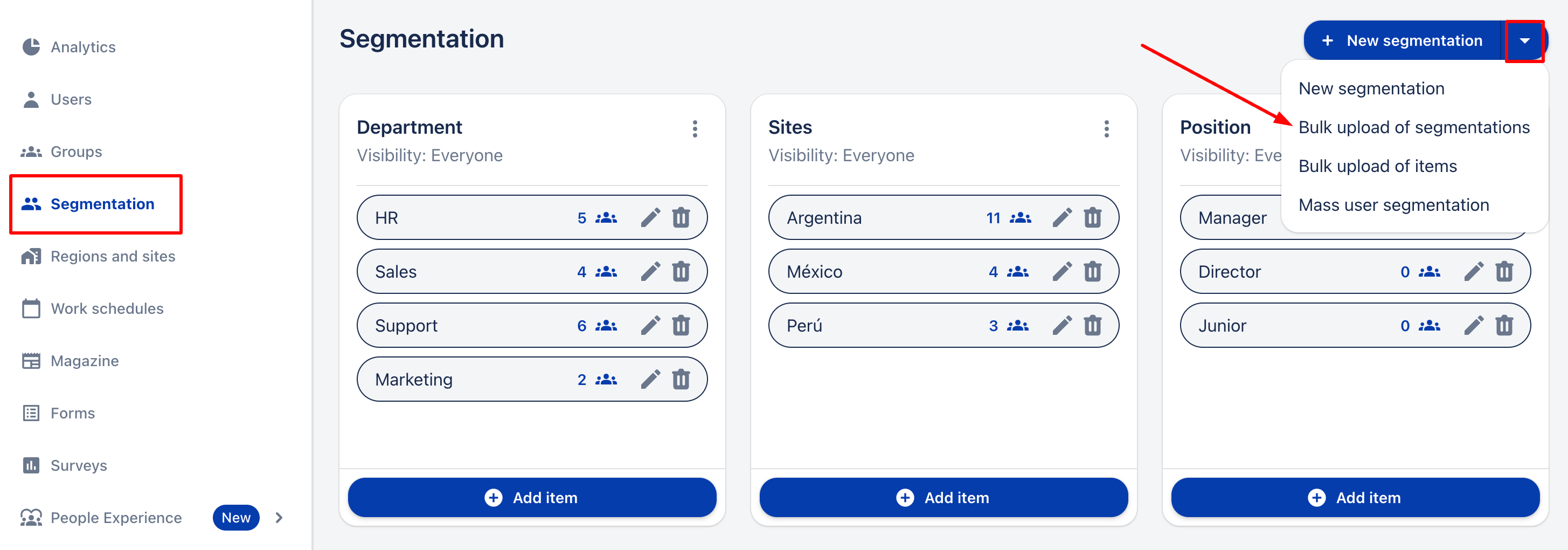 3. Отидете в падащото меню (⬇️), разположено вдясно, до "+ Нова сегментация", и след това кликнете върху "Масово качване на сегментации".