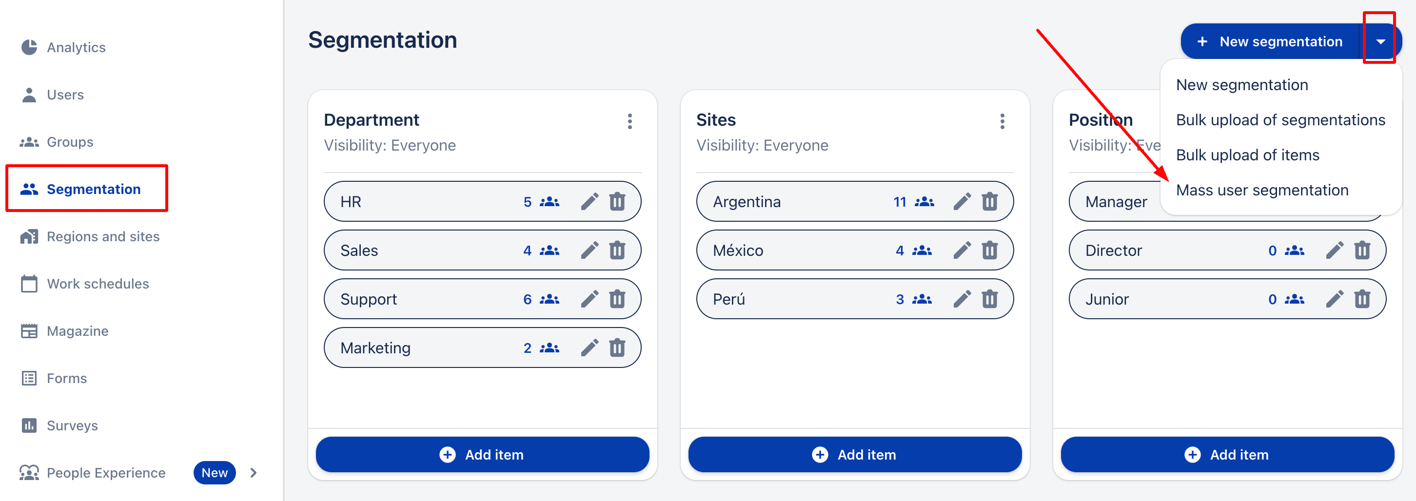 3. Отидете в падащото меню (⬇️), разположено вдясно, до "+ Нова сегментация", и след това кликнете върху "Масова сегментация на потребители".