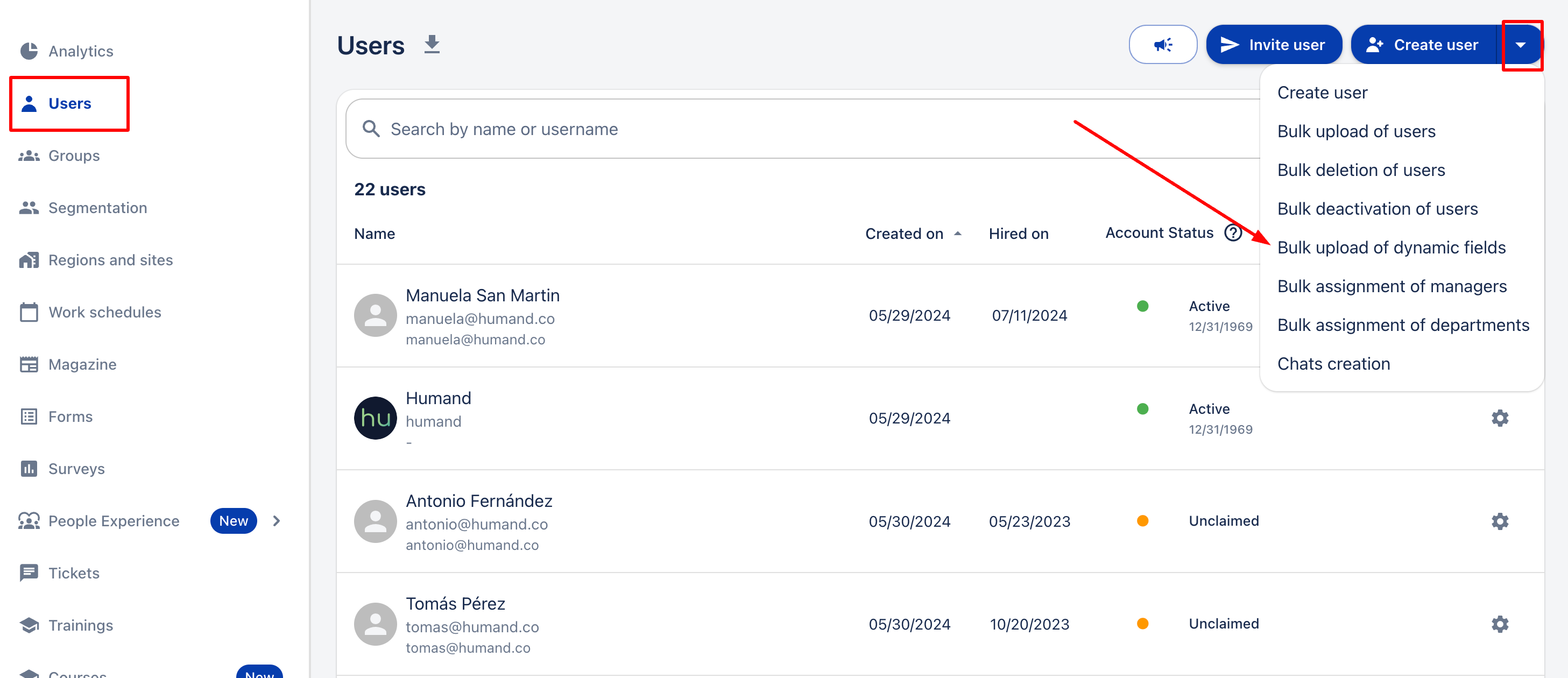 2. От секцията Потребители изберете опцията "Масово качване на динамични полета".