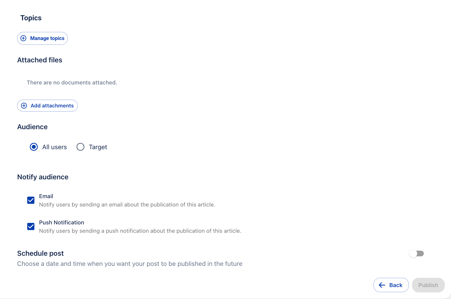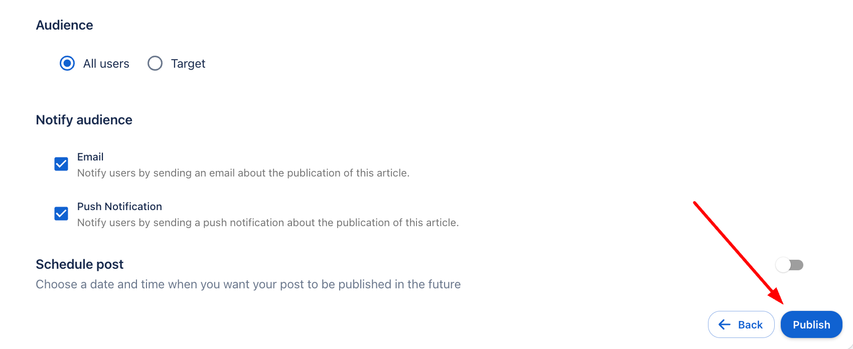 - Уведомите потребителите за публикуването на статията чрез изпращане на push известие и/или имейл