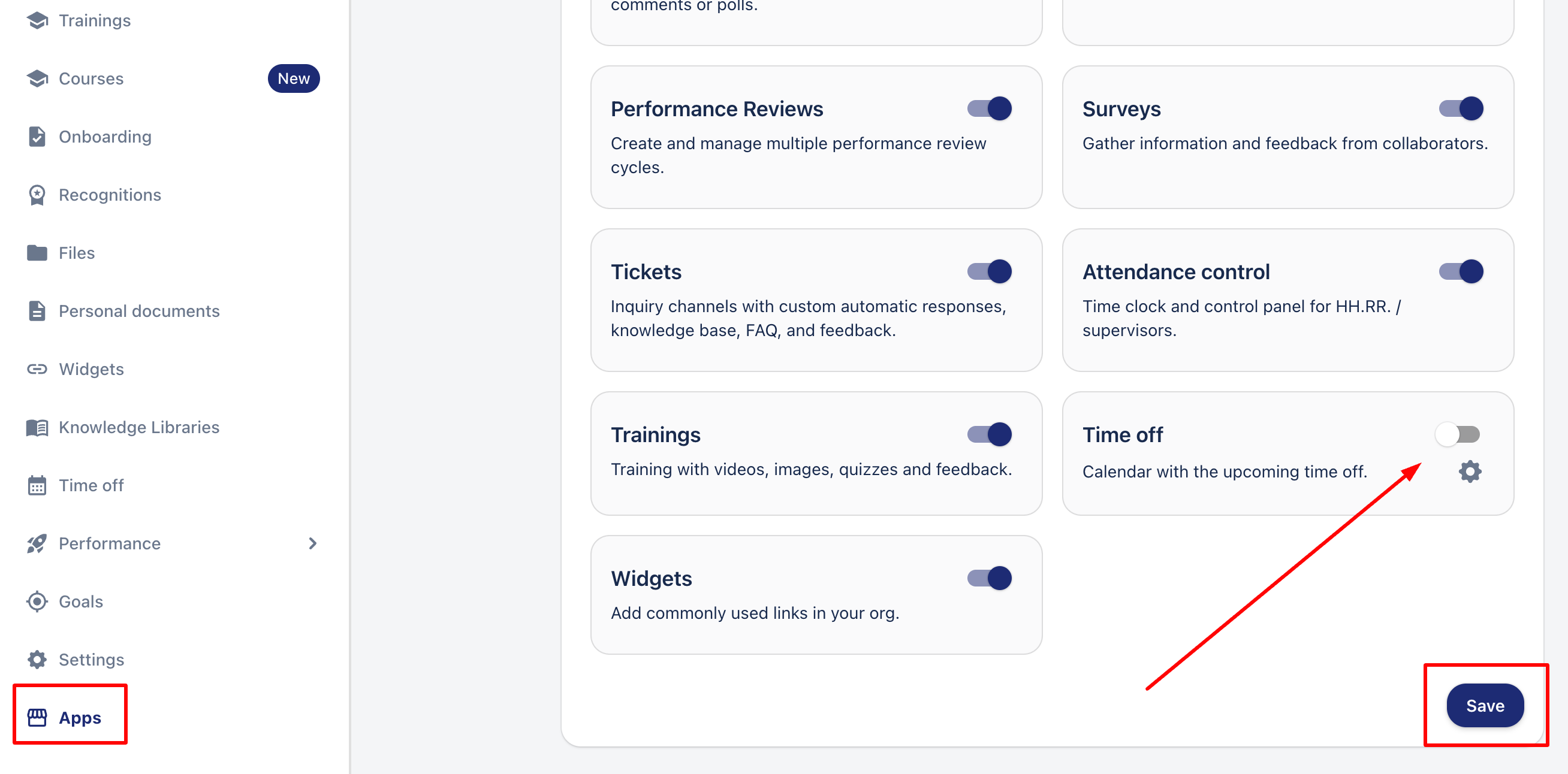 3. Оттук активирайте модула "Отпуски" и след това кликнете върху "Запази":