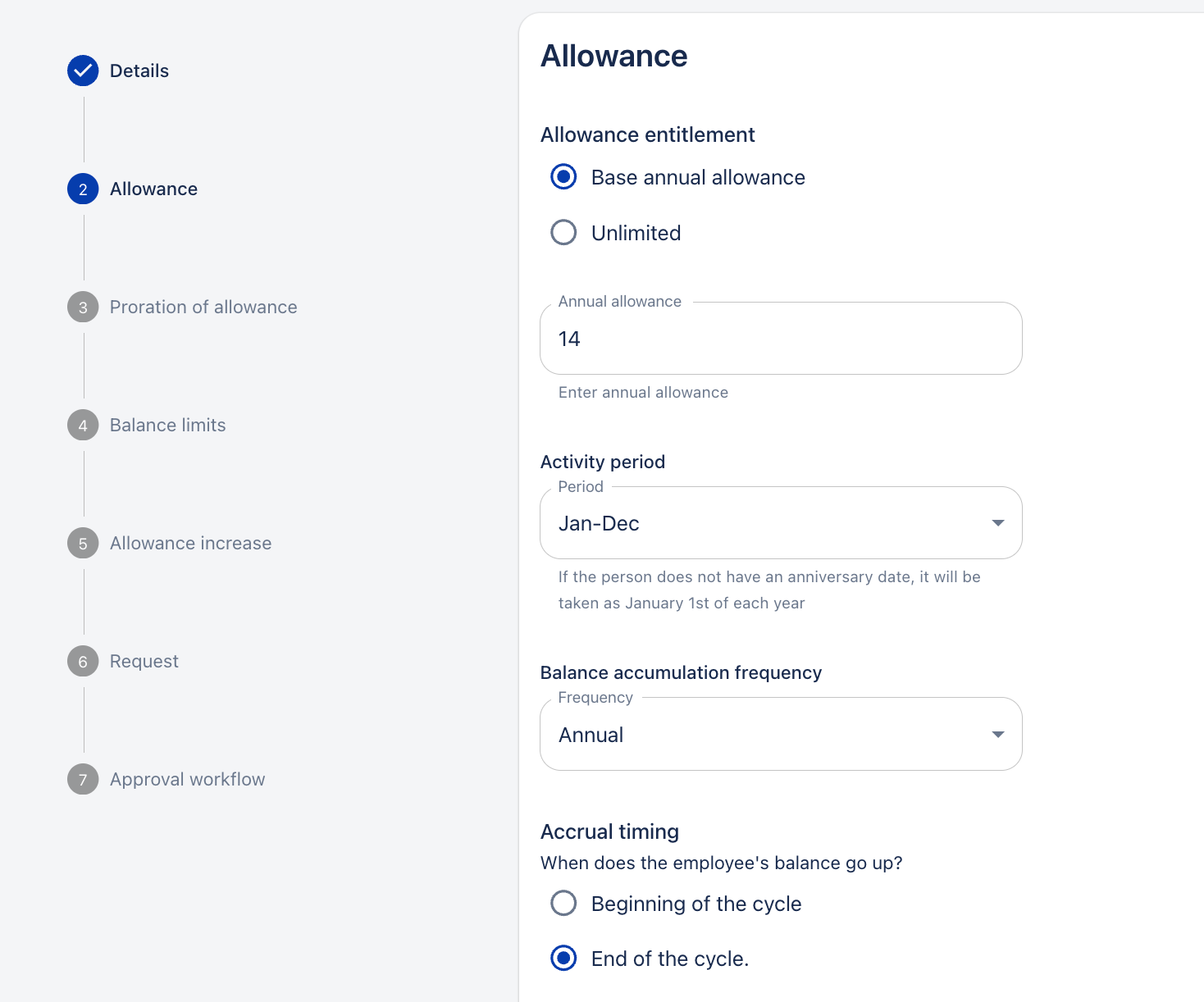 Минимален баланс в началото на цикъла: Брой дни, които могат да бъдат изтеглени напред за следващия цикъл. Ако не искате това да е възможно, трябва да го оставите на 0. Ако искате да може да изтегли 5 дни, трябва да го зададете на -5.