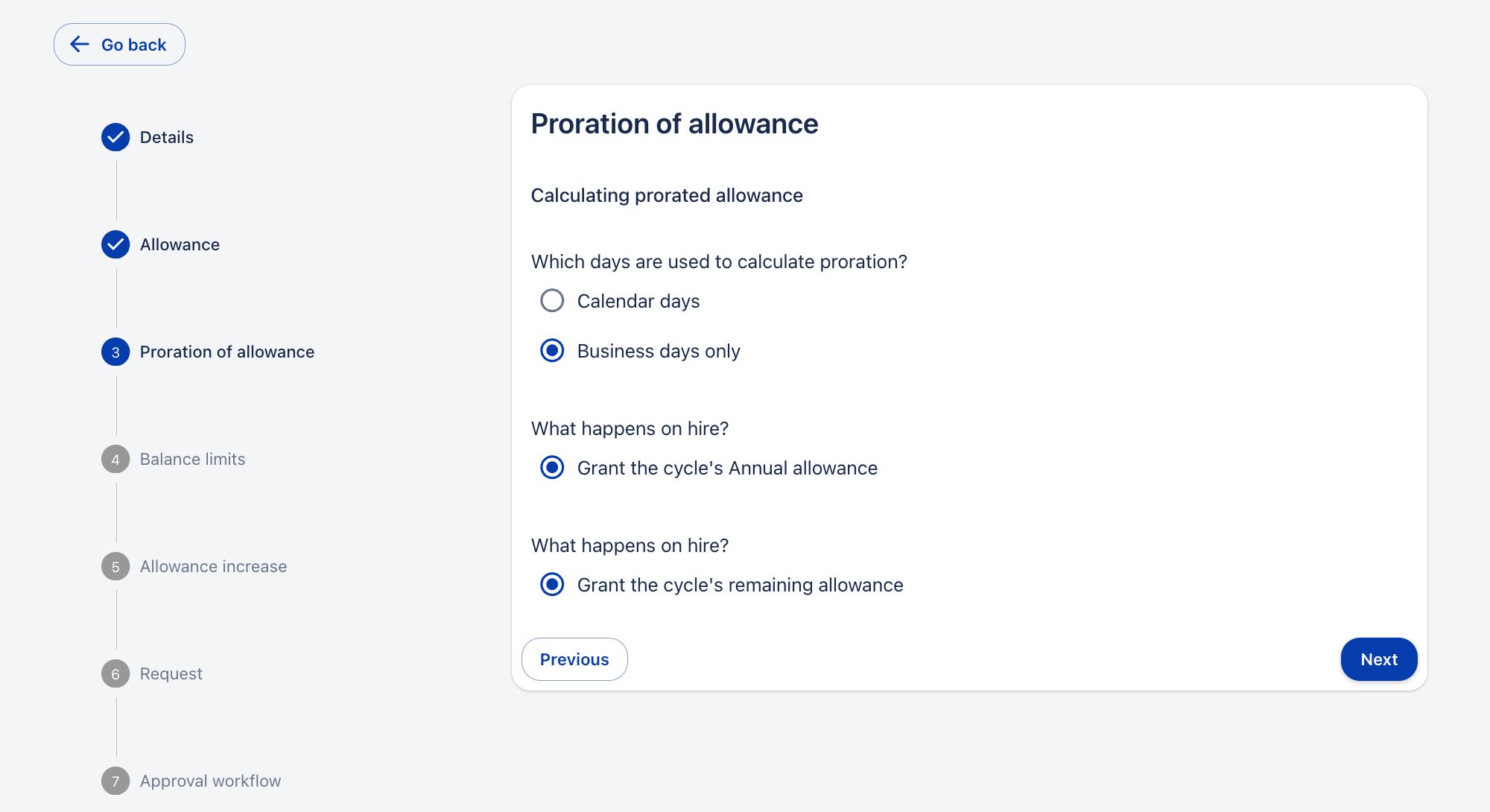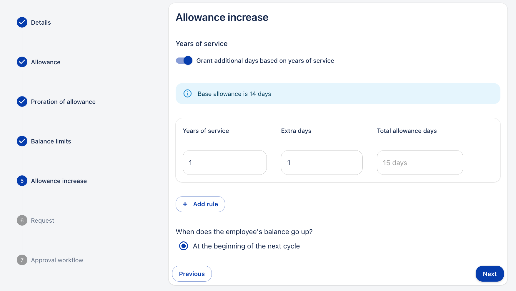 - Максимален баланс в края на цикъла: Определя максималния брой дни, които могат да бъдат заявени в цикъл. Например, ако служител има 21 дни ваканция и пренасяне от 14 дни от предишния цикъл, можете да конфигурирате, че служителят може да заяви максимум 28 дни.