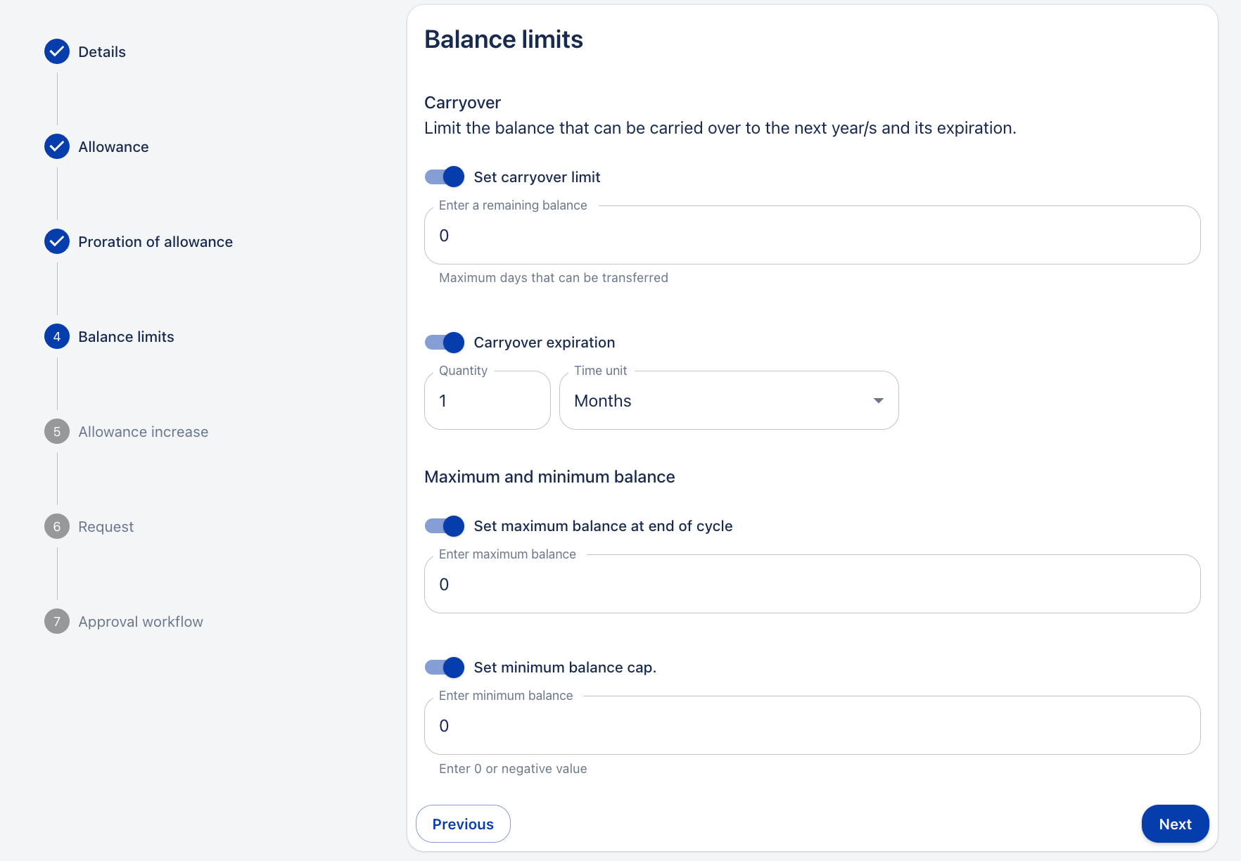 Ограничения на баланса: Можете да решите дали част от баланса на период може да бъде пренесена към следващия период или дали дни от следващия период могат да бъдат изтеглени напред. По закон, в някои страни това е възможно само с част от ваканцията, така че трябва да настроите: