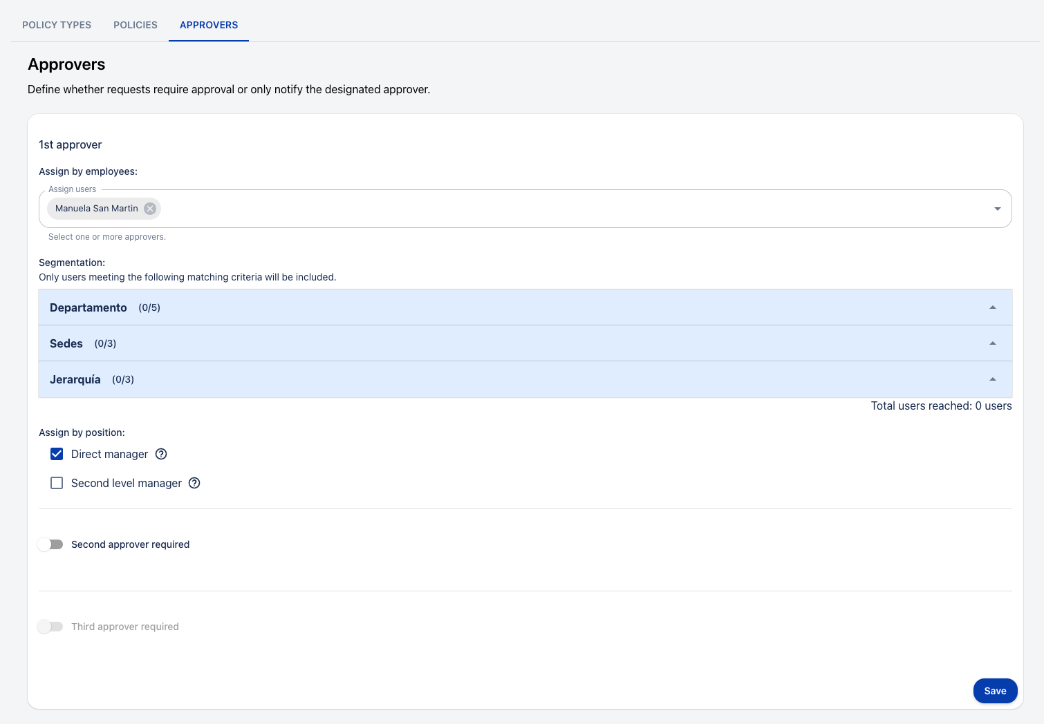 В рамките на тип политика можем да имаме няколко вътрешни политики или правила, които ще управляват видовете политики, които сътрудниците могат да заявят, в зависимост от структурата на компанията.