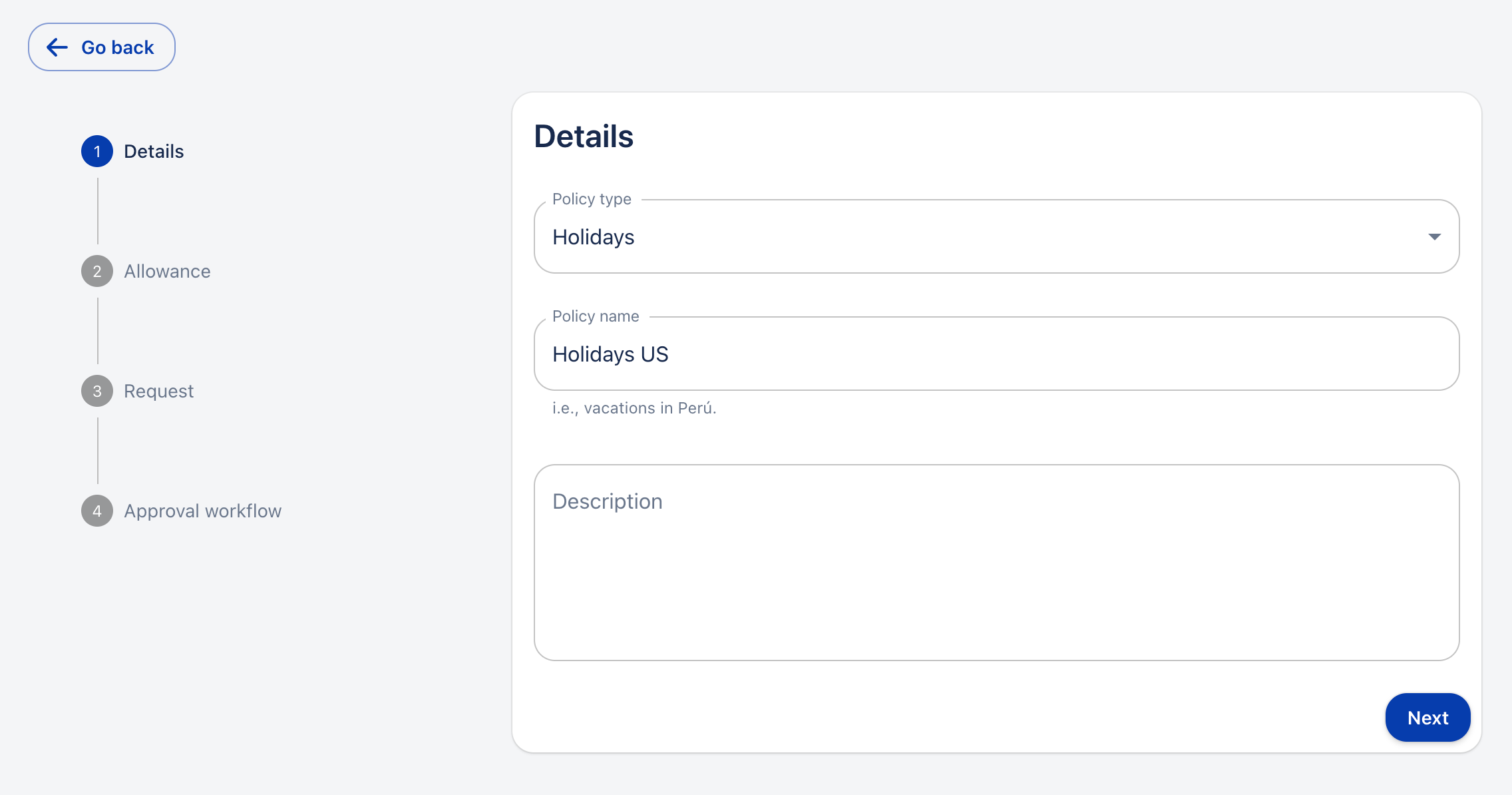 Име на политика: Името на политиката не е видимо за сътрудниците. Пример: Празници в Аржентина, Празници за ръководители и т.н.