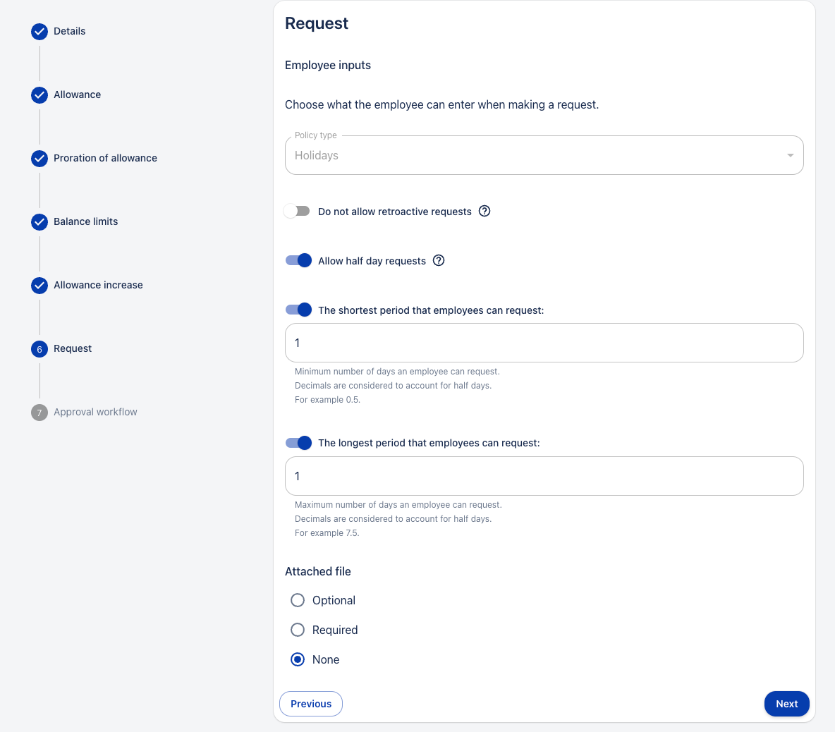 - Най-краткият период, който служителите могат да заявят. Например: Ако зададете "1", служителят ще може да вземе 1 ден ваканция.