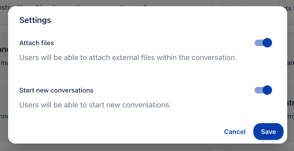 - Прикачване на файлове: определете дали потребителите ще могат да прикачват външни файлове в своите разговори.