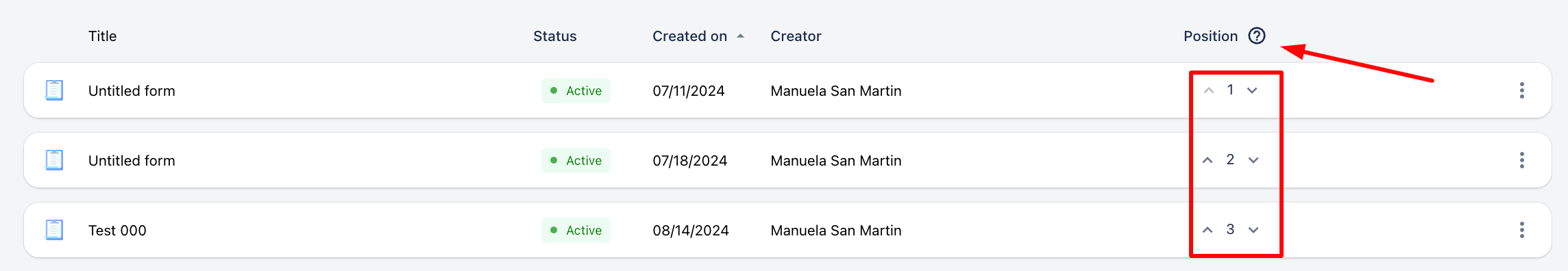 За да пренаредите позицията на формулярите в изгледа на сътрудника, трябва да кликнете върху стрелките (↑↓) в колоната „Позиция“ на всеки формуляр.
