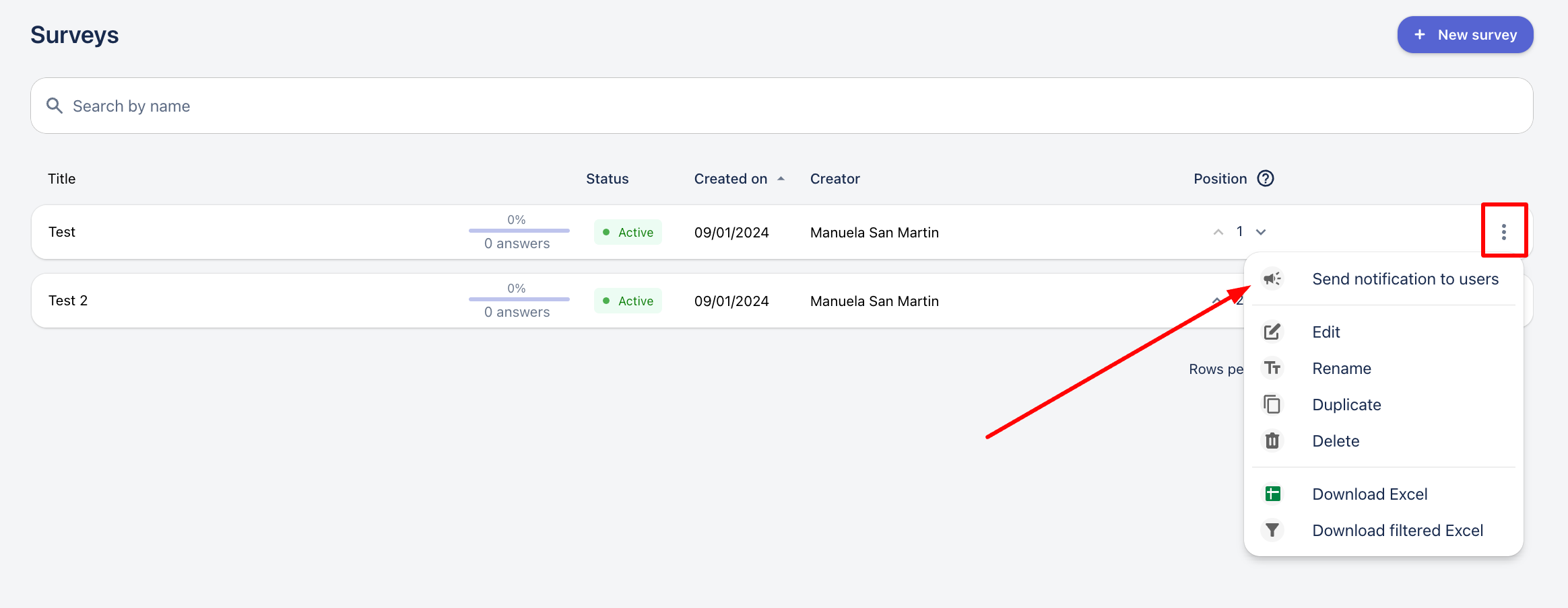 3. Кликнете върху трите точки, разположени от дясната страна на всяка анкета в основния раздел, и след това кликнете върху „Уведомяване на потребителите“.