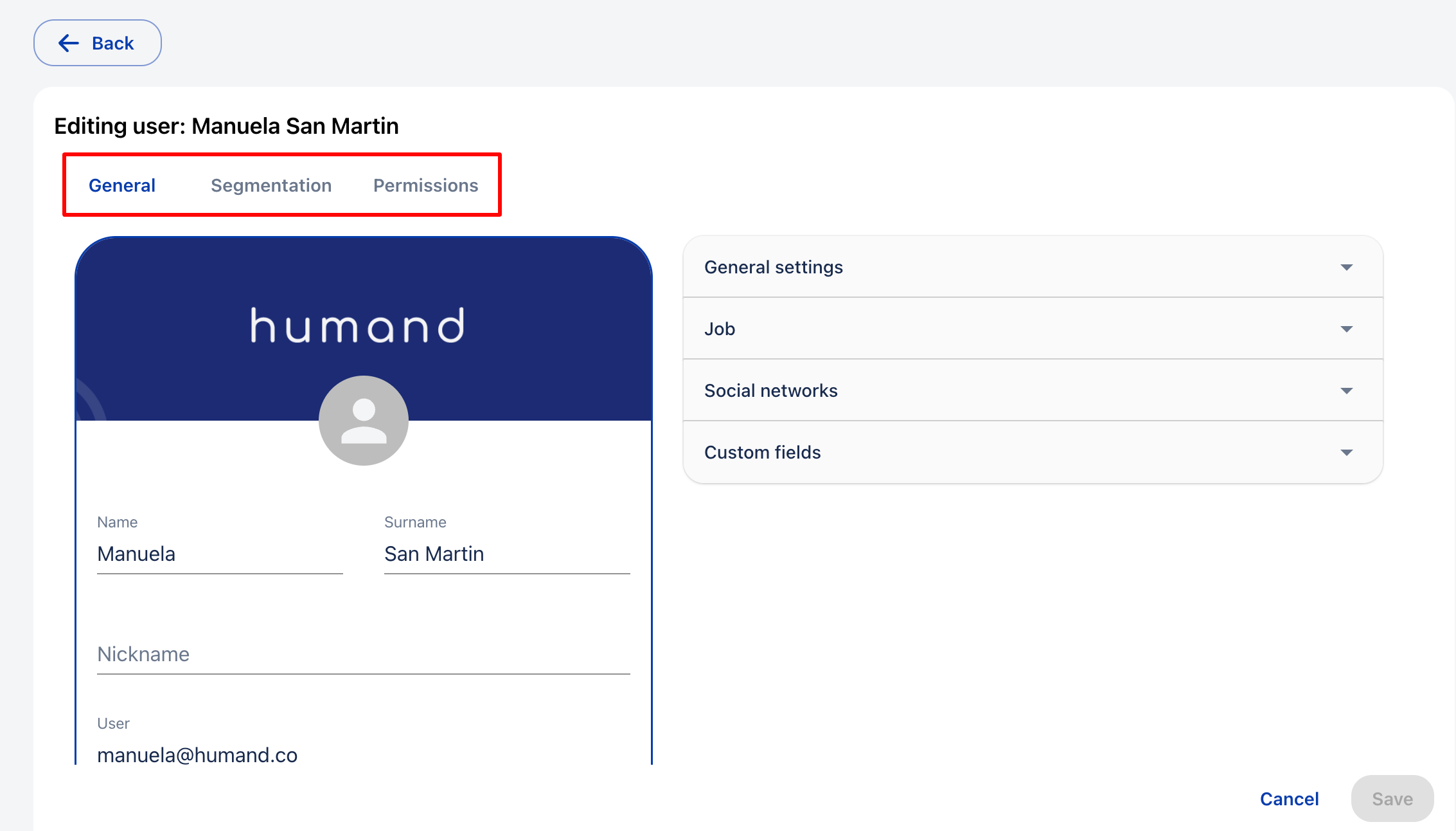 Освен това, от таба Сегментация можете ръчно да редактирате елементите на сегментация, към които този потребител ще принадлежи, и да промените от таба Разрешения конкретно разрешенията, които този потребител ще има.