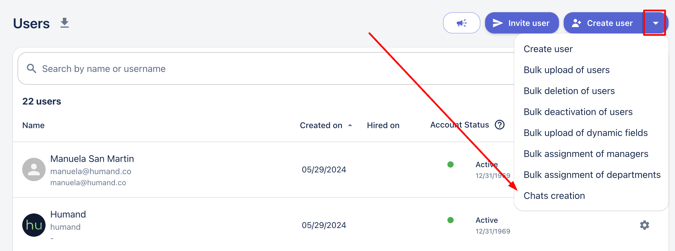 2. От секцията Потребители, кликнете върху опцията "Създаване на чатове"