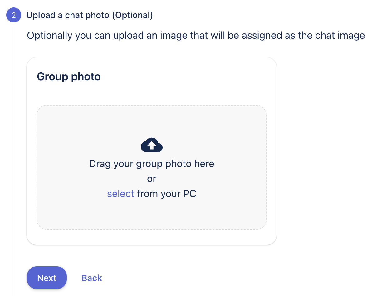 Просто изберете име за груповия чат и, ако желаете, изберете снимка за него. Администраторите на чата ще могат да променят снимката, ако пожелаят, след като чатът бъде създаден.