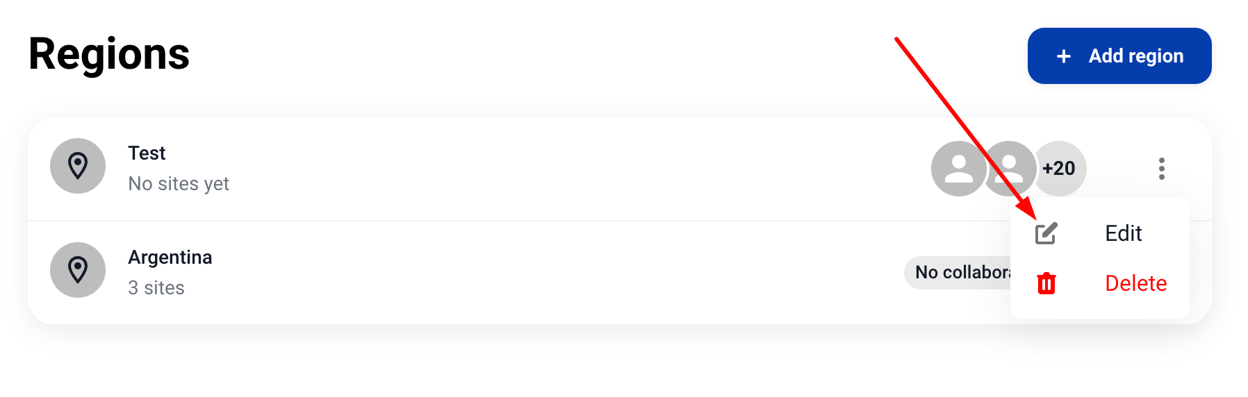 3. Кликнете върху бутона с три точки (⋮) на региона, в който искате да добавите сайта, и след това кликнете върху Редактиране.