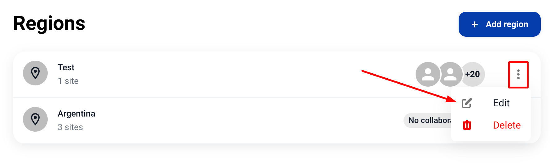 3. Кликнете върху трите малки точки (⋮) на съответния регион и след това изберете "Редактиране".