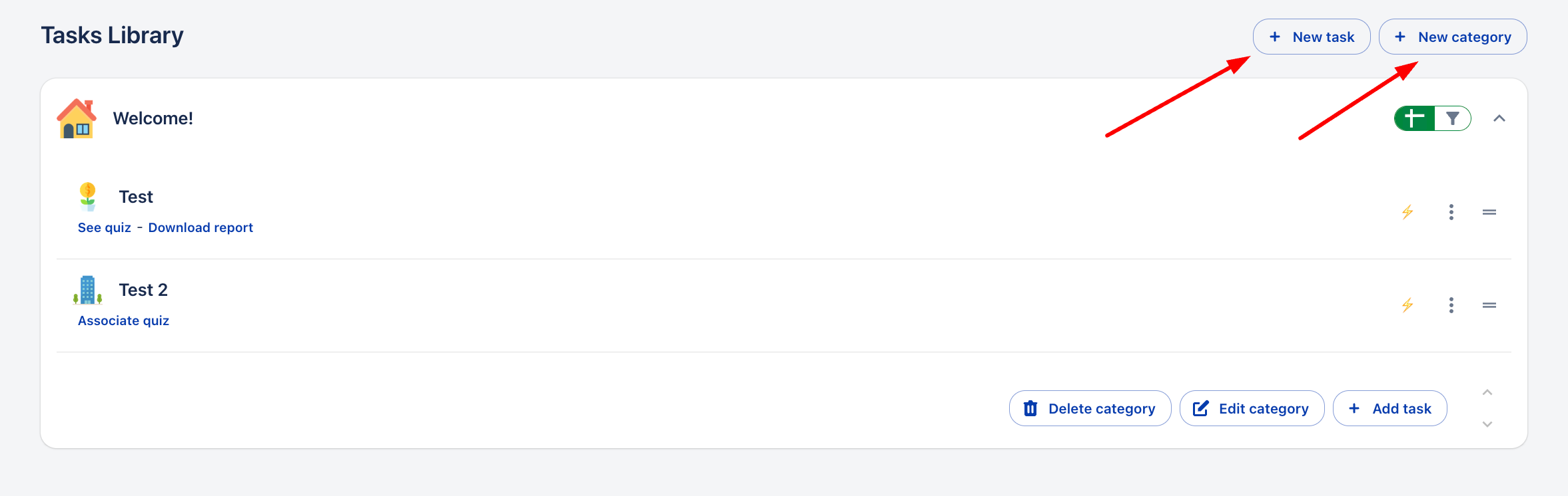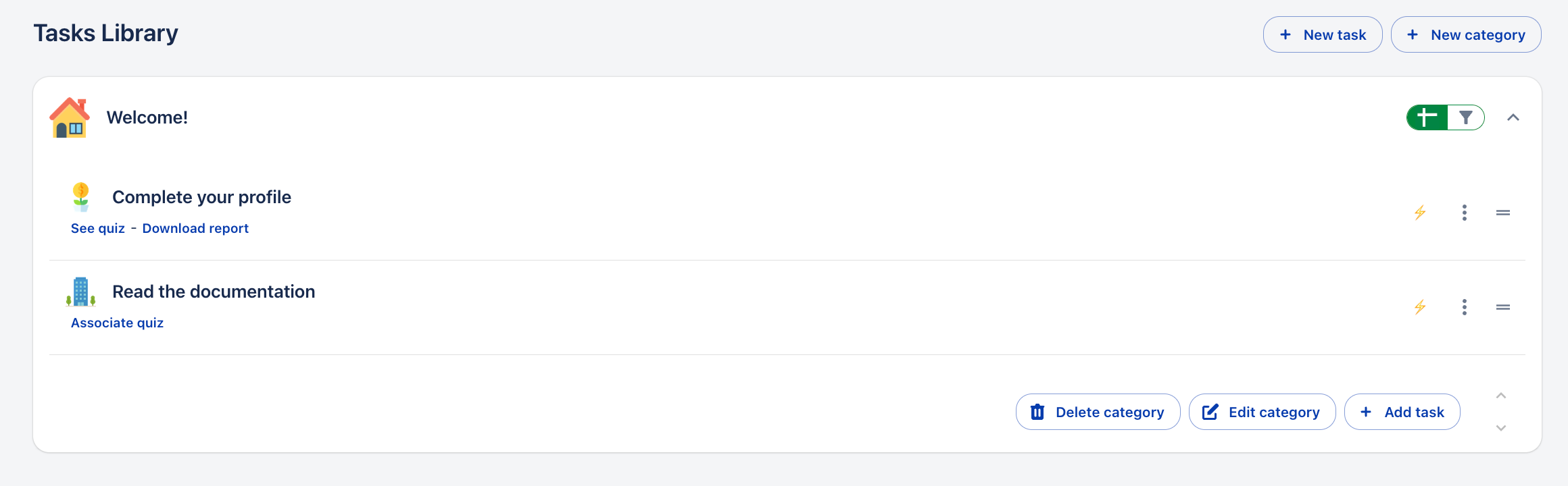 В модула Onboarding трябва да създадете задачи и категории. Задачите са дейностите, които трябва да бъдат изпълнени от всеки назначен сътрудник, и те са организирани в категориите, които създавате за вашата общност.