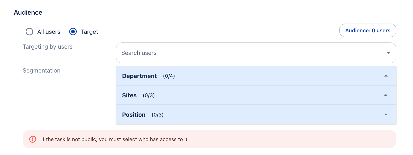 Изберете за коя аудитория е предназначена задачата, на кои сътрудници ще я възложите. Можете да изберете всички потребители или да изберете сътрудници според сегментациите на вашата общност.