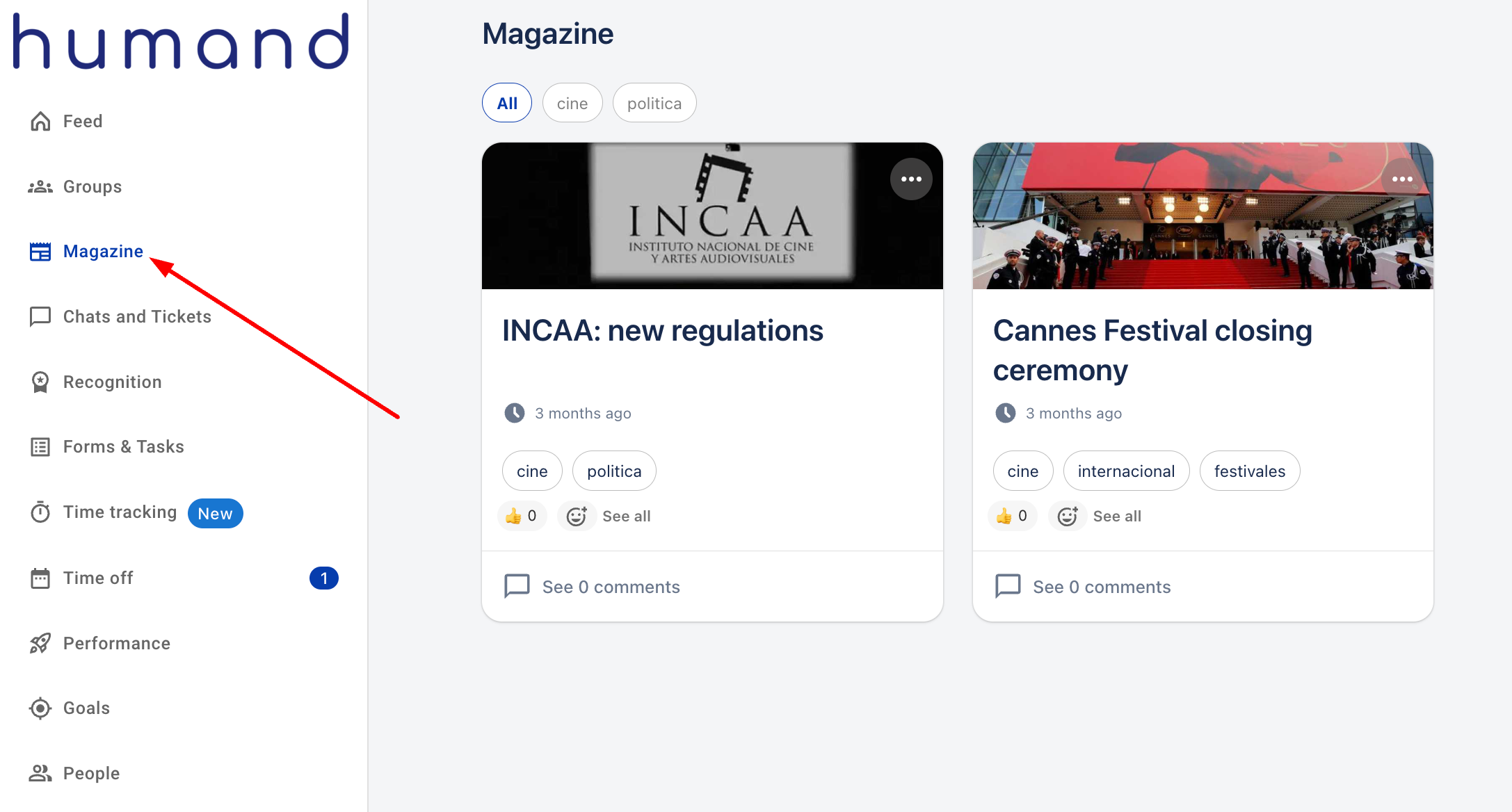 Тук обясняваме как да разглеждате и всички възможности за взаимодействие, които имате с Списанието на вашата общност, както от Humand Web (PC), така и от приложението Humand: