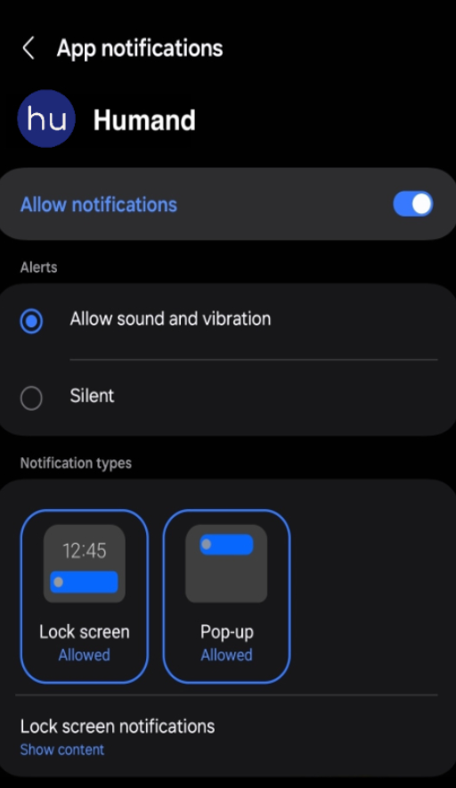 Android: Отворете Настройки > Приложения > Humand > Известия на вашия телефон.