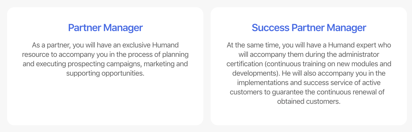 - Сертификация за администратор на Humand: Сертификацията се състои от технически курс, който ще завърши с асинхронен изпит и изграждане на общност от нулата, която да бъде представена на мениджъра за успех на партньорите.