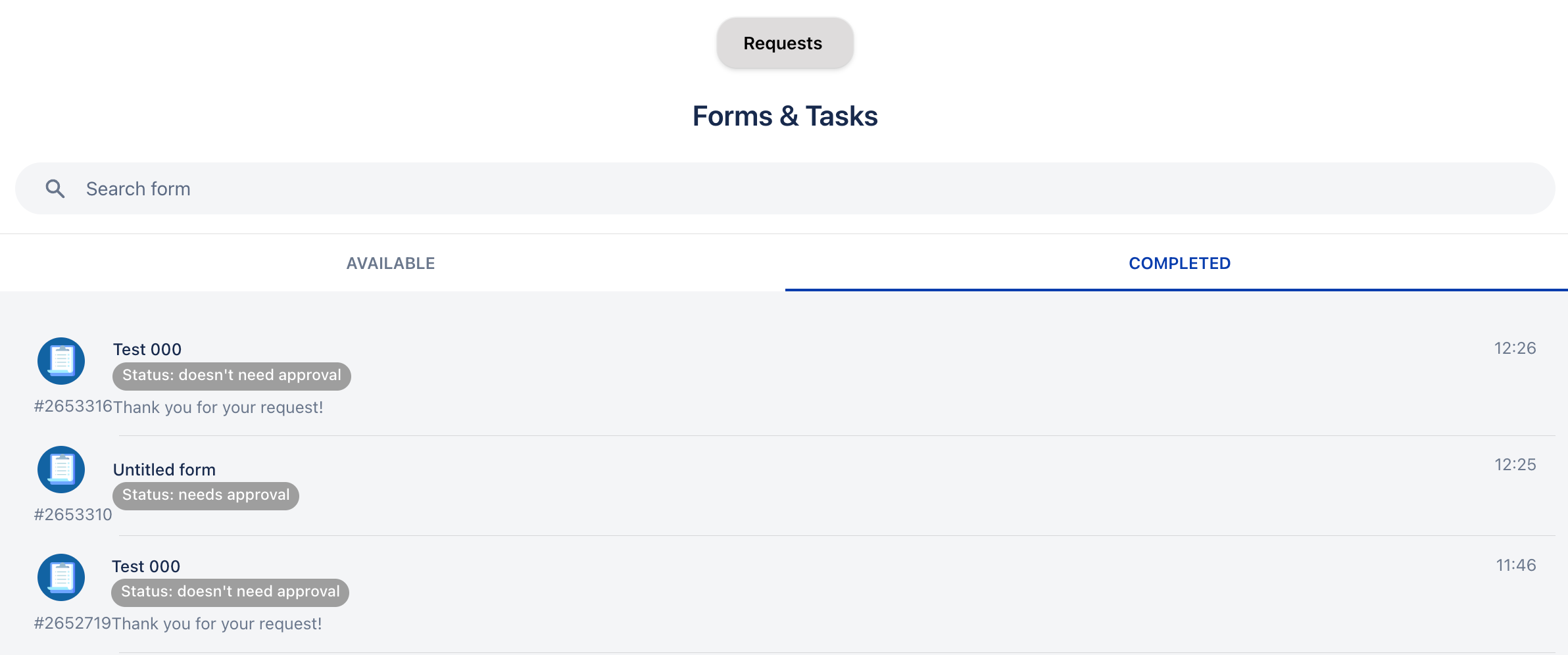 Завършени: В тази секция са налични всички формуляри, които сте попълнили, заедно със състоянието на тяхното проследяване. Ако формулярът изисква одобрение, след като бъде одобрен, актуализираното му състояние ще бъде отразено тук.