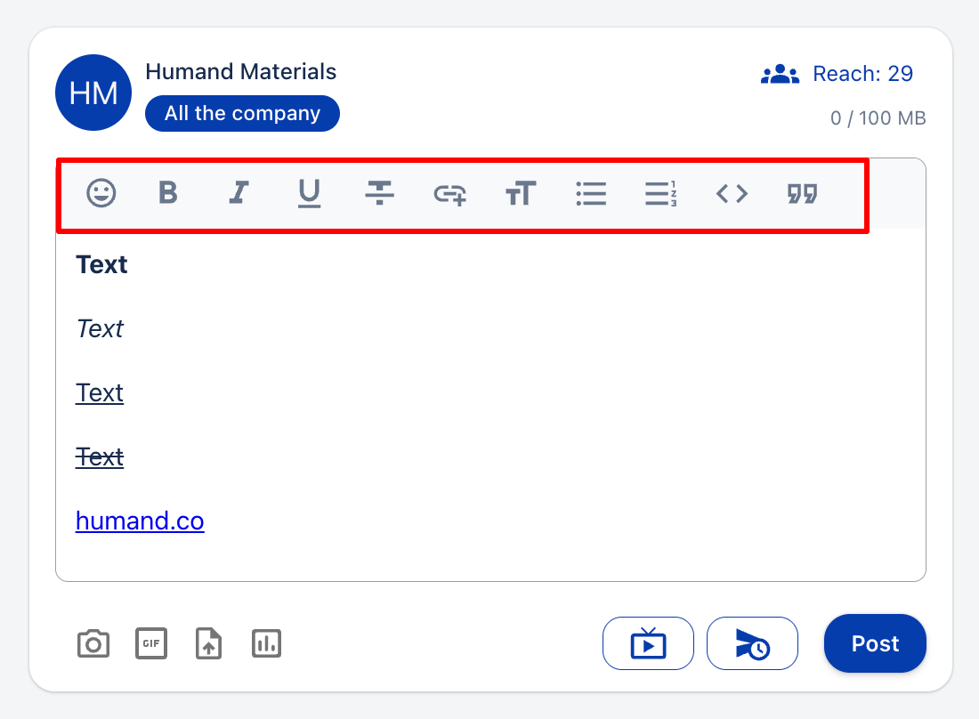 - За да използвате някоя от опциите за форматиране, трябва да ги изберете от лентата, която се показва в долната част на текстовото поле, вътре в публикацията: