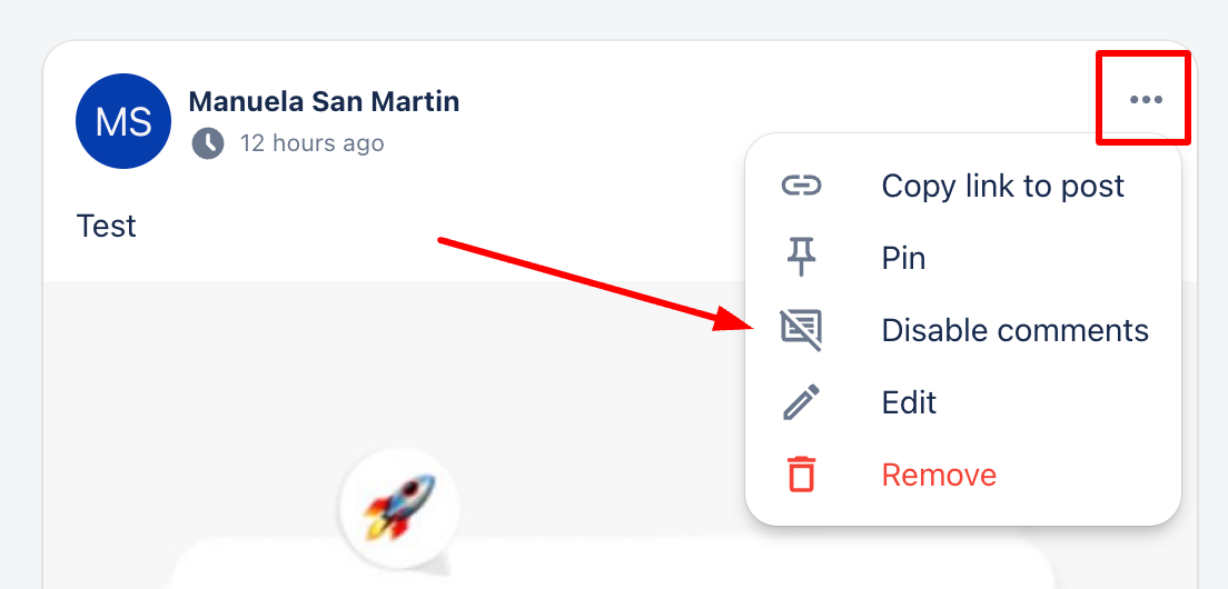 Ето стъпките, които да следвате, за да деактивирате коментарите на публикация във вашия общностен фийд, било то от Humand Web или Humand App: