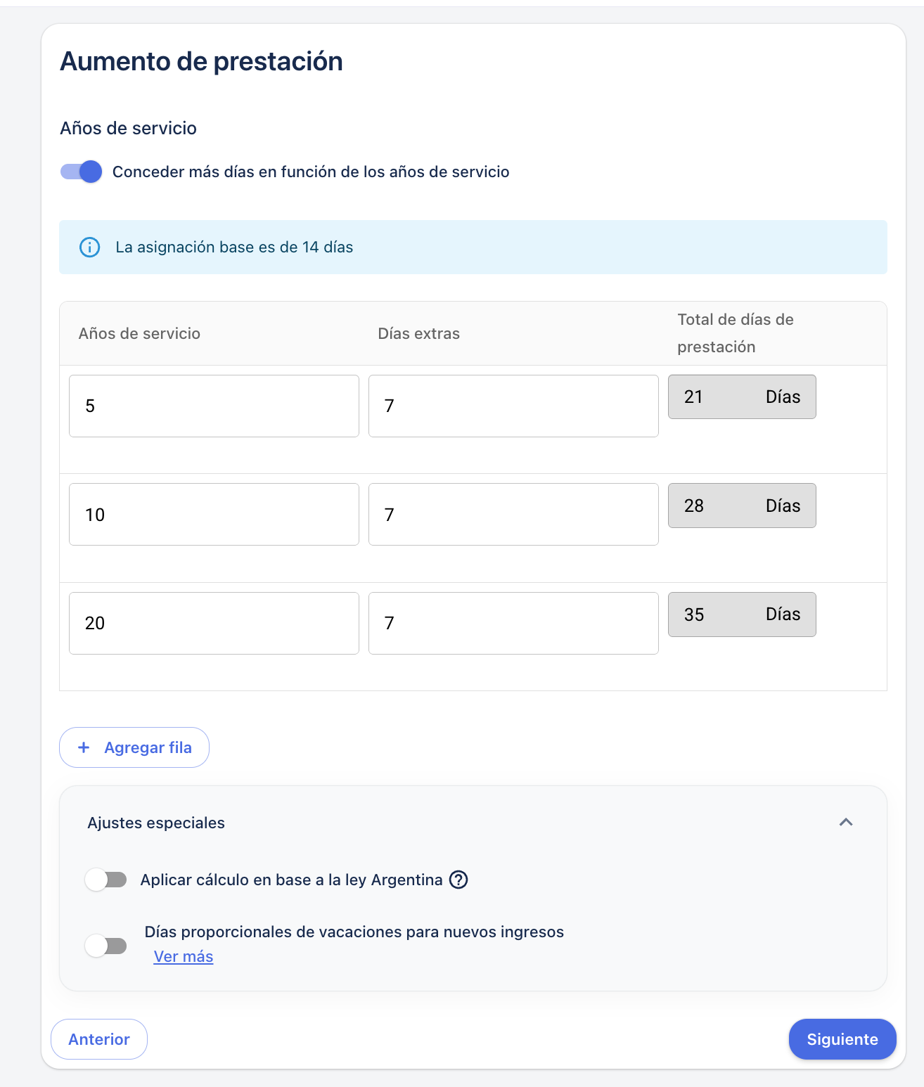 Активирайте увеличението на облагата за години стаж, като настроите 7 допълнителни дни на 5, 10 и 20 години.