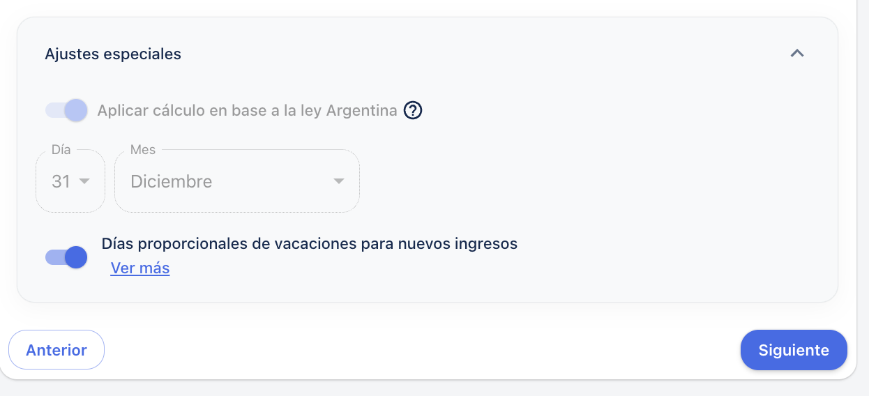 - Прилагане на изчисление според аржентинското законодателство. Съгласно аржентинския закон, изчисляването на стажа за цикъл (октомври-септември) се взема предвид до 31 декември. Възможно е да се настрои специална корекция на цикъла, така че стажът да се изчислява по този начин.
