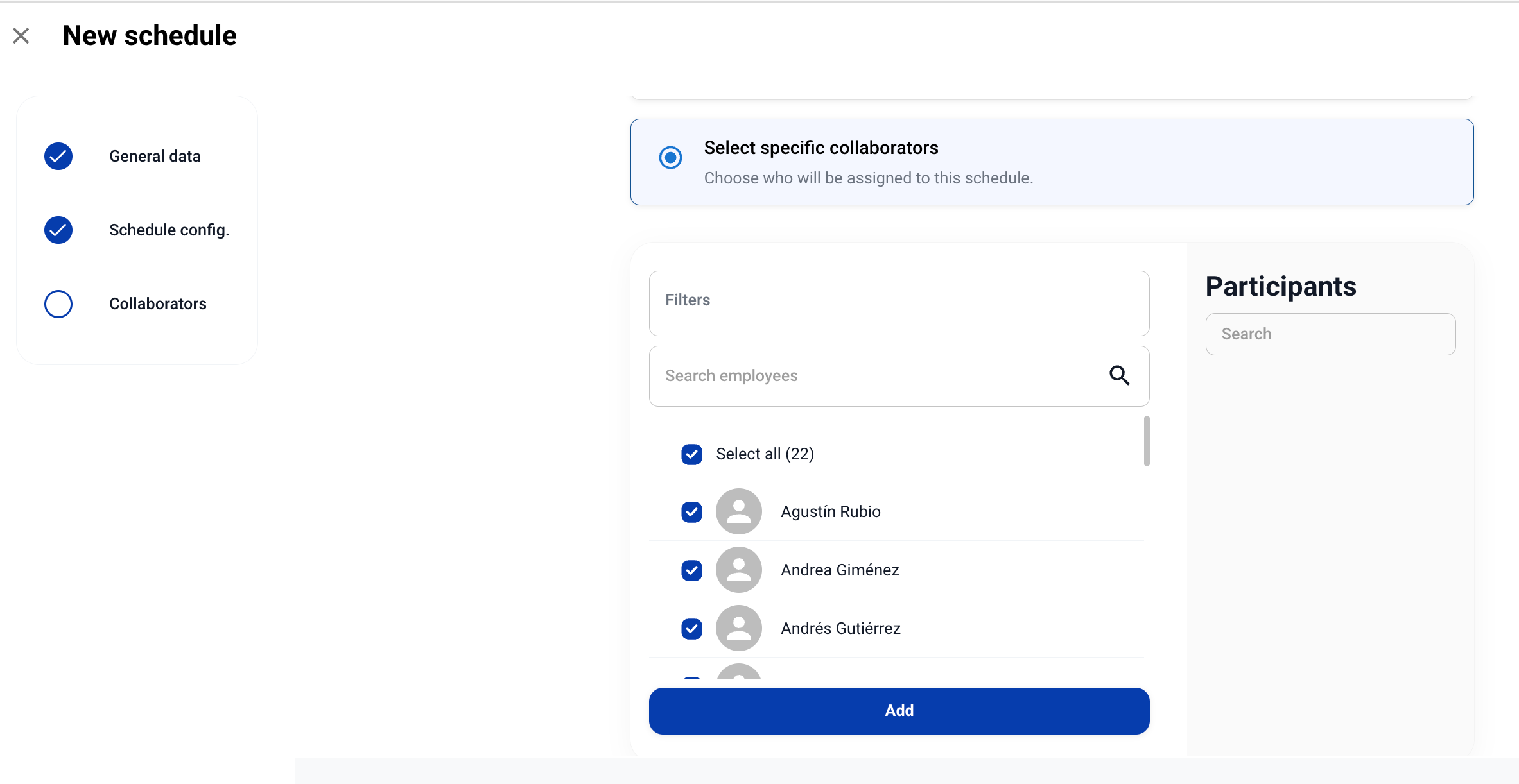 Накрая, присвоете на новия сайт хората, които ще бъдат част от него. Можете да ги добавите, като търсите индивидуално всеки сътрудник или като използвате сегментациите, създадени във вашата общност (филтри).