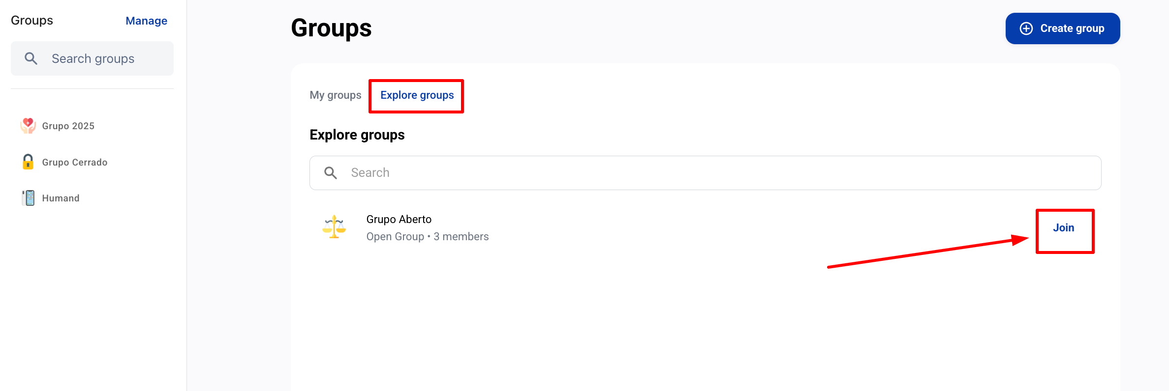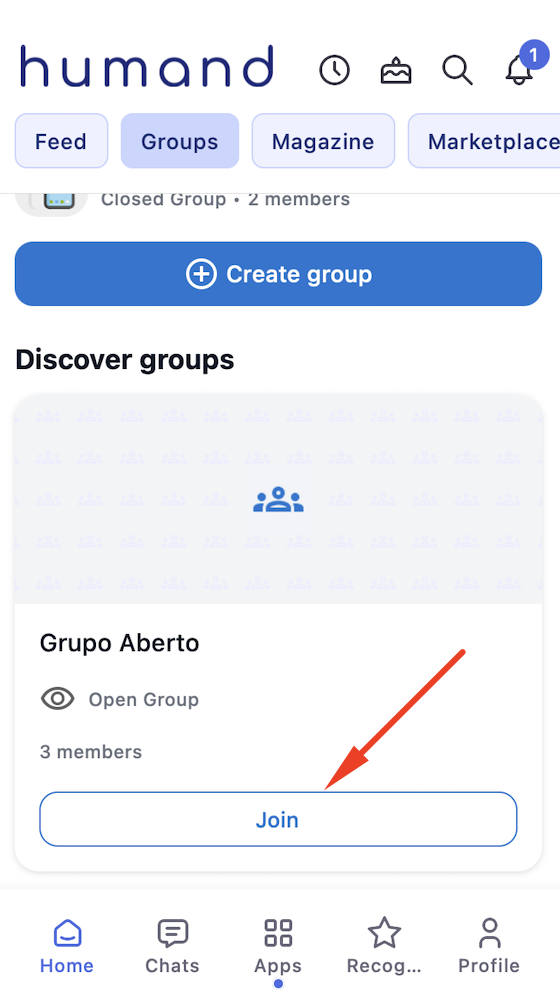 - От секцията "Открийте групи" (само за затворени групи) в мобилната версия на Humand App.