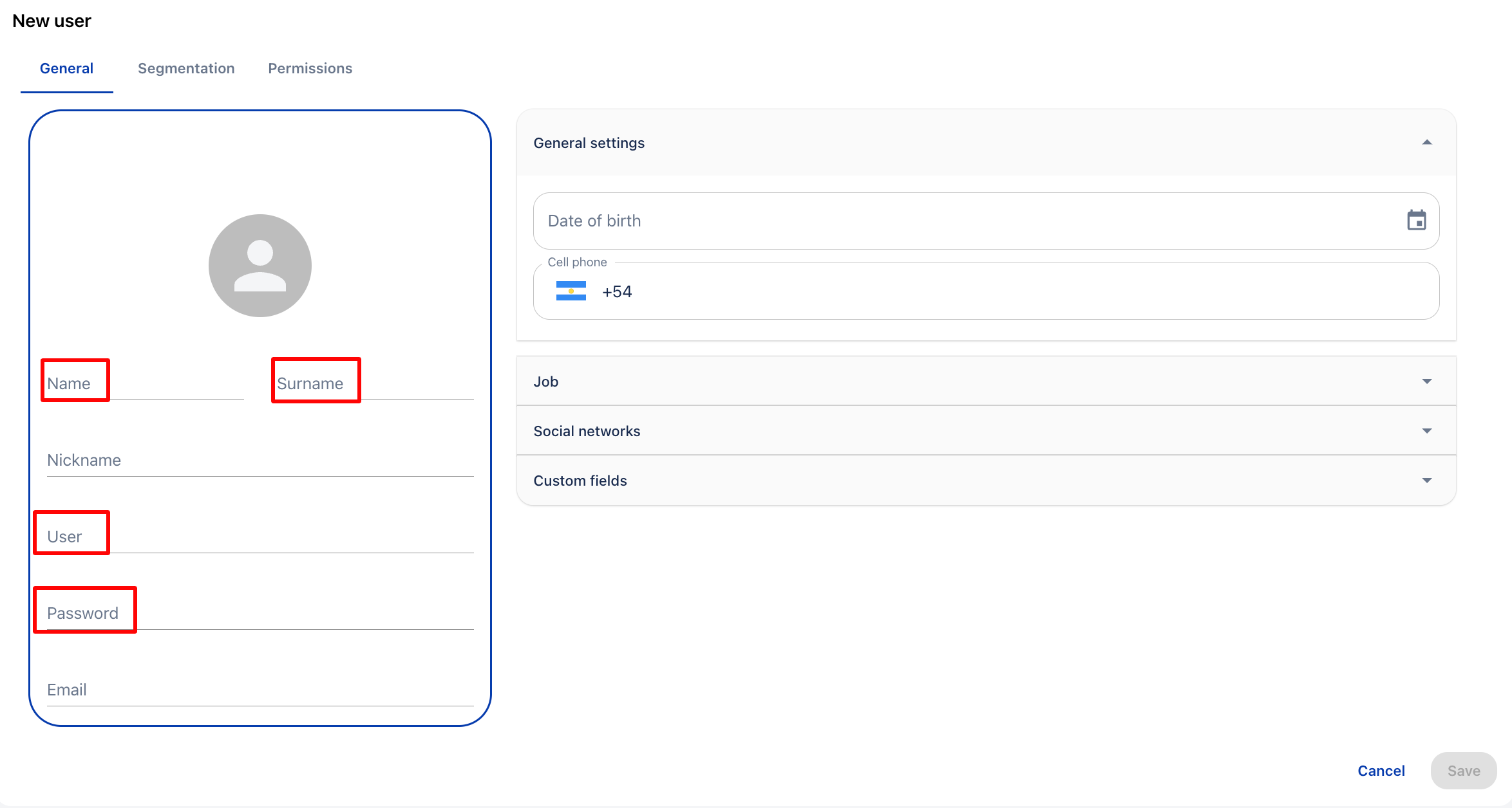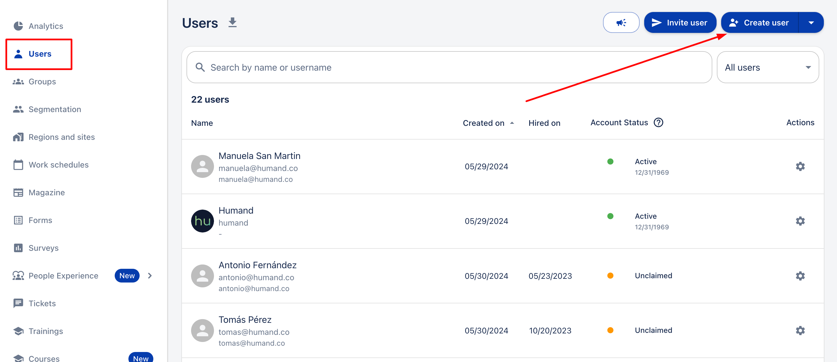 - Потребител: с тези данни потребителят ще влиза в Humand. Единствените позволени специални символи са. @ - +.