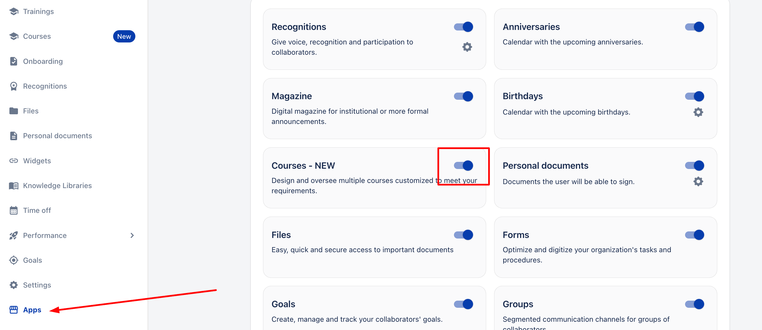 За да направите модула Курсове видим, така че вашите сътрудници да могат да виждат създадените курсове, трябва да следвате стъпките по-долу: