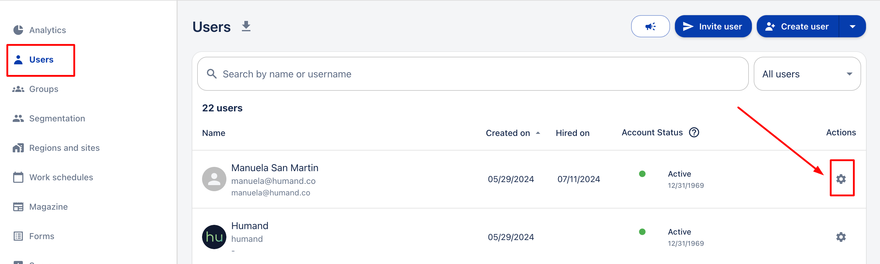 3. Намерете потребителя и кликнете върху неговите настройки ⚙️.