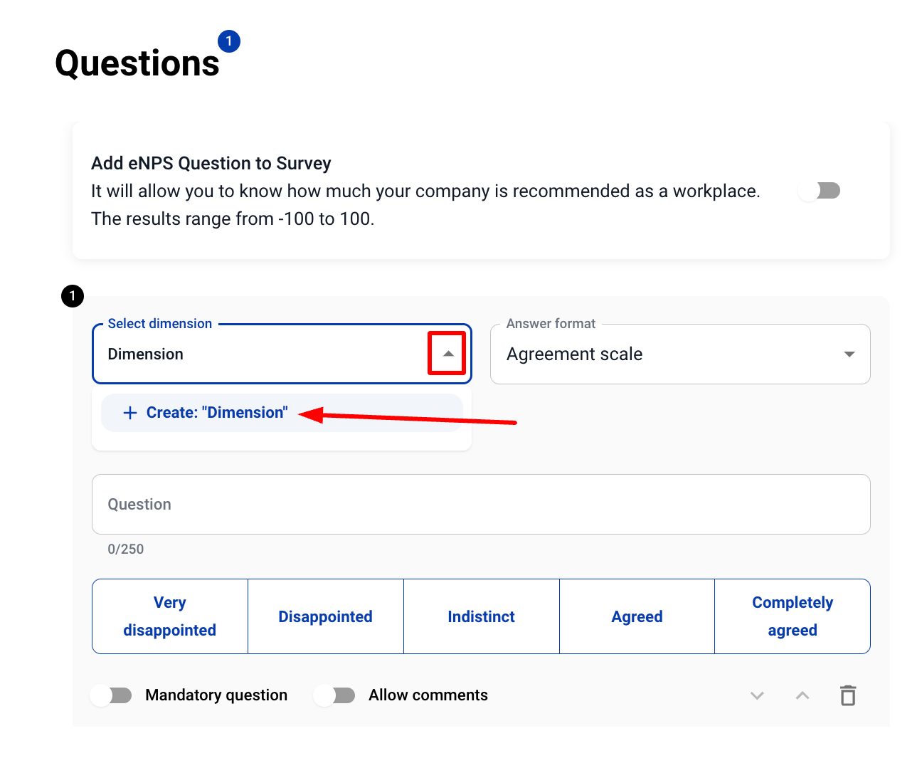 Трябва също така да създадете измеренията, към които по-късно ще отнесете тези въпроси. За да създадете измерение, трябва да кликнете върху полето “Select dimension”, да въведете новото измерение и след това да кликнете върху “+ Create”.