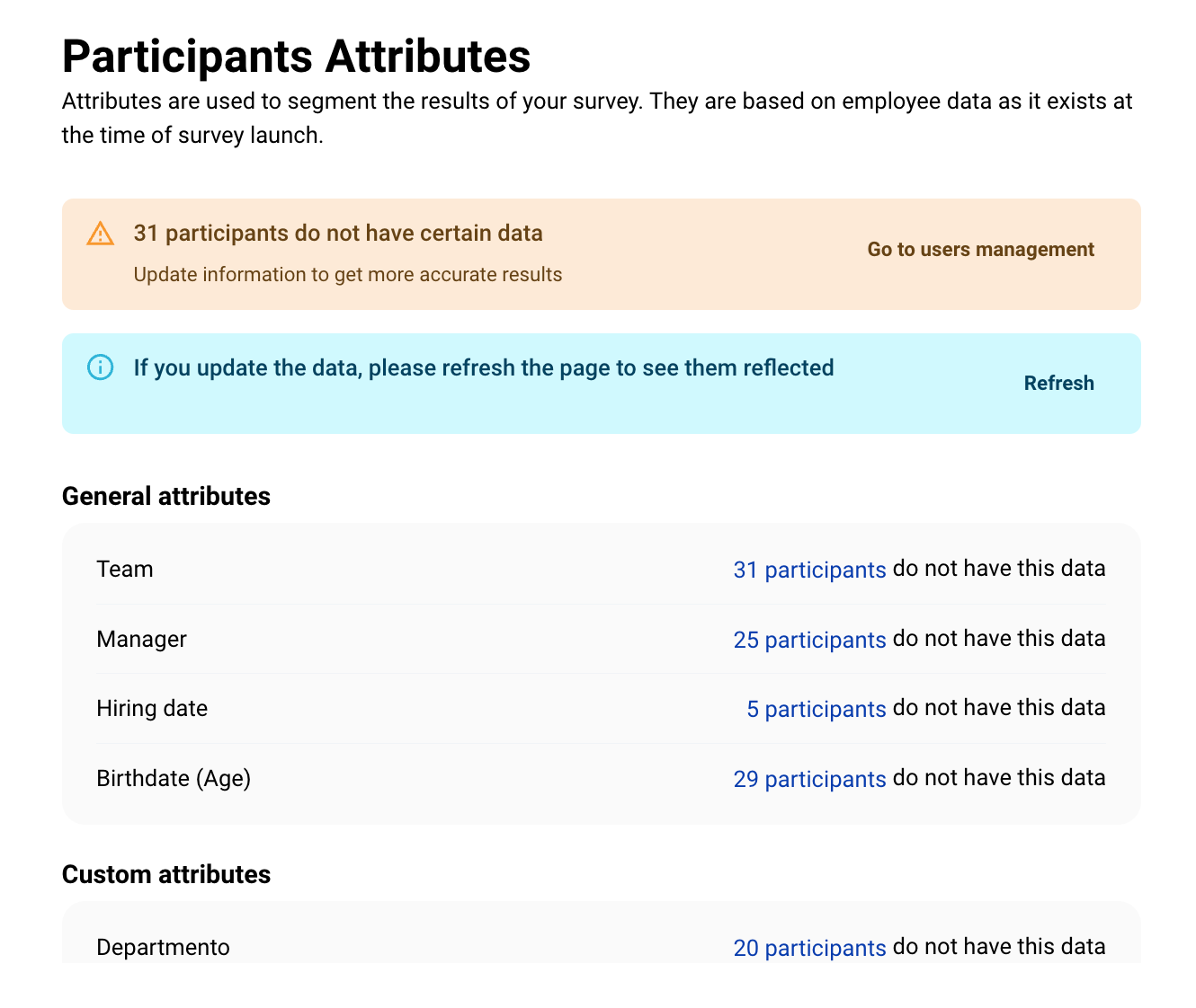 Те се използват за сегментиране на резултатите от вашата анкета и се базират на информацията на потребителя по време на създаването на анкетата. Препоръчваме да актуализирате информацията и да попълните тези полета, за да получите възможно най-точни резултати.
