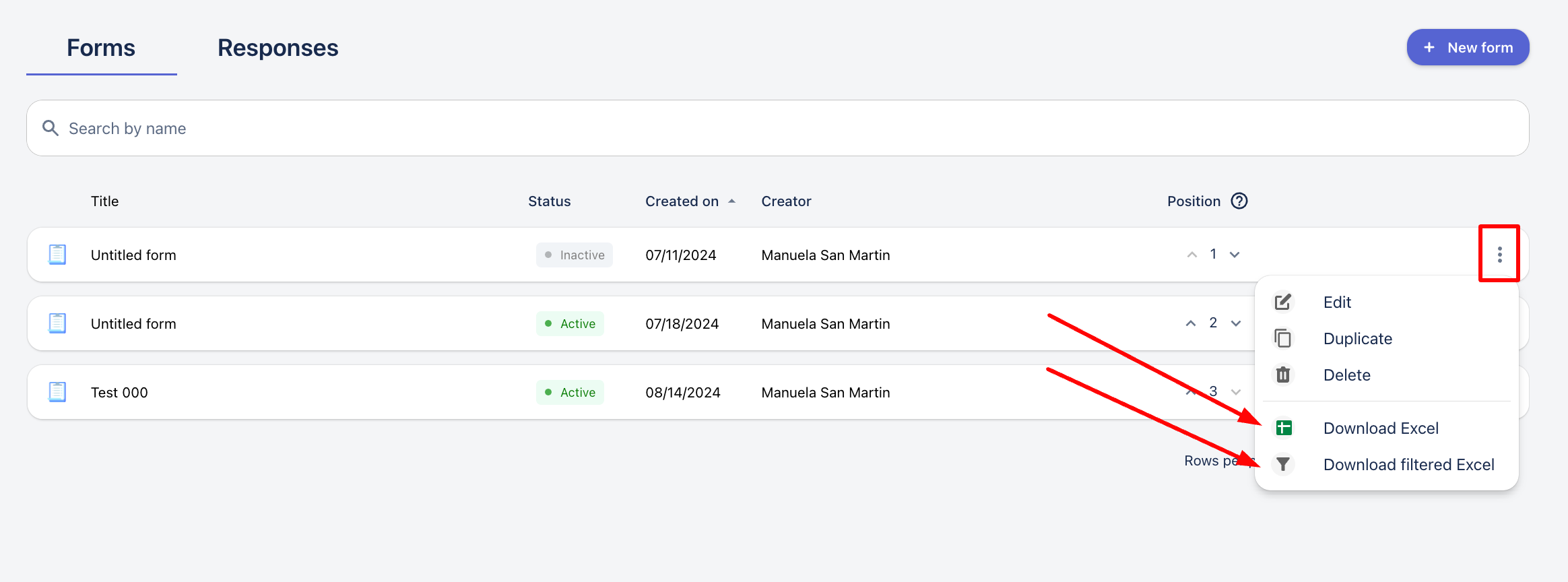 2. В секцията Формуляри отидете на конкретния формуляр, от който искате да получите отчета, и кликнете върху бутона с 3 точки. (⋮).