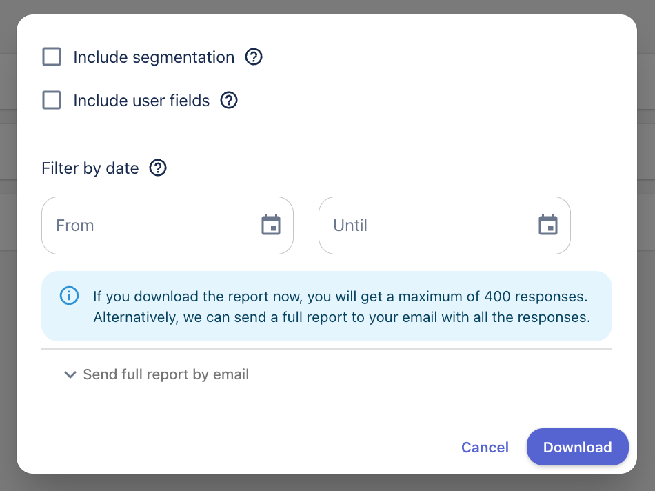 Ако изтеглите отчета в тази секция, той ще включва максимум 400 отговора. Алтернативно, можете да изберете опцията да изпратите пълен отчет на вашия имейл с всички отговори.