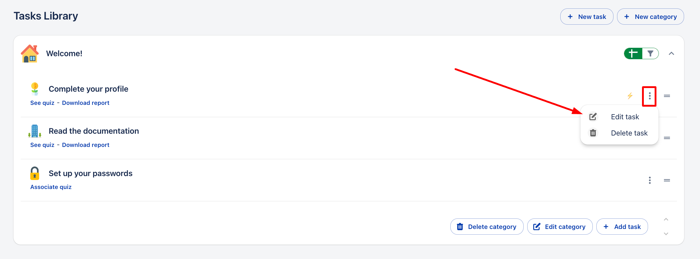 2. От секцията Onboarding отидете в категорията, където се намира задачата, която искате да редактирате.
