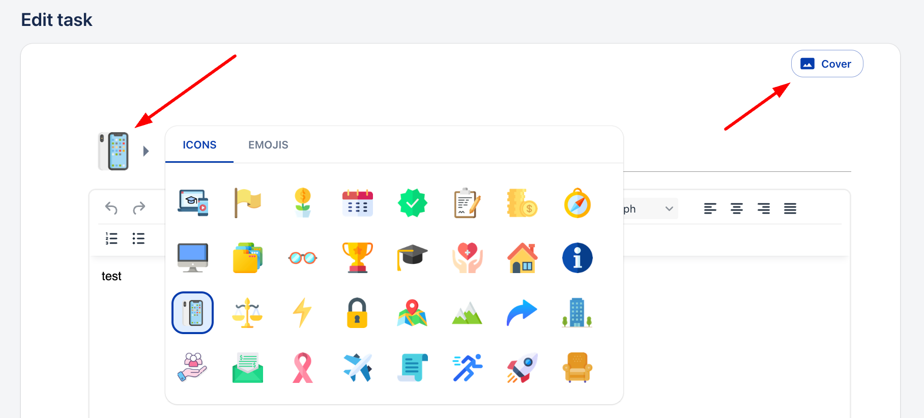 4. Като кликнете върху иконата на задачата, можете да изберете коя снимка или емоджи искате да се показва в задачата. Същевременно, в бутона Корица можете да качите снимка за корица, която да се показва в задачата.