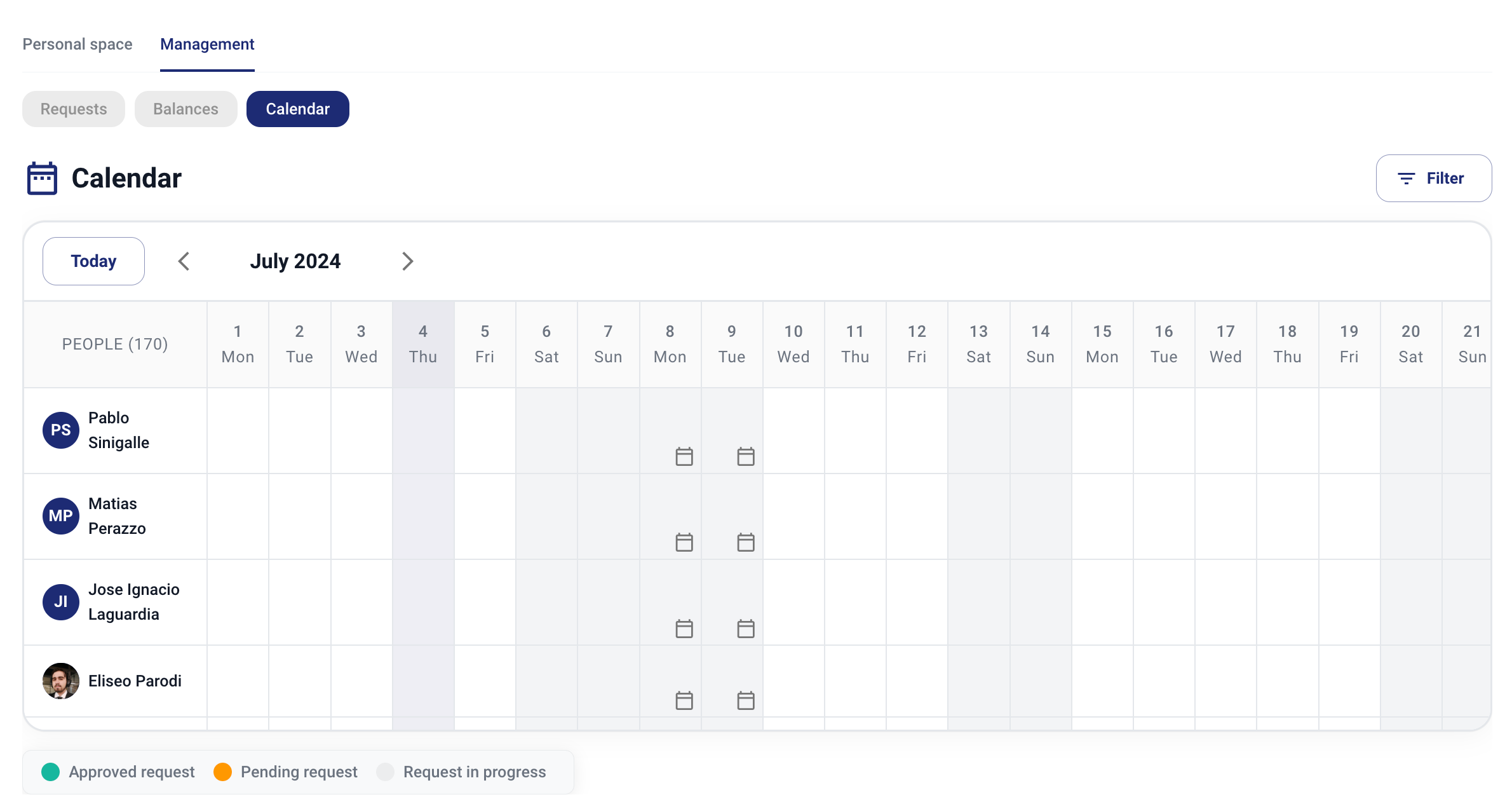 Календарът за отпуски улеснява управлението за администратори и мениджъри, като им позволява да преглеждат и одобряват заявки по по-визуален начин. В случая на администратори, те ще виждат заявките на всички служители; а в случая на мениджъри, те ще виждат само заявките на служителите от техния екип.
