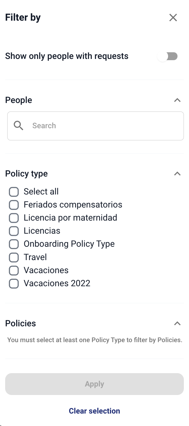 Можете също така да филтрирате по човек, тип политика, политика и статус на заявката, за да показвате в календара само заявките, които ви трябват.