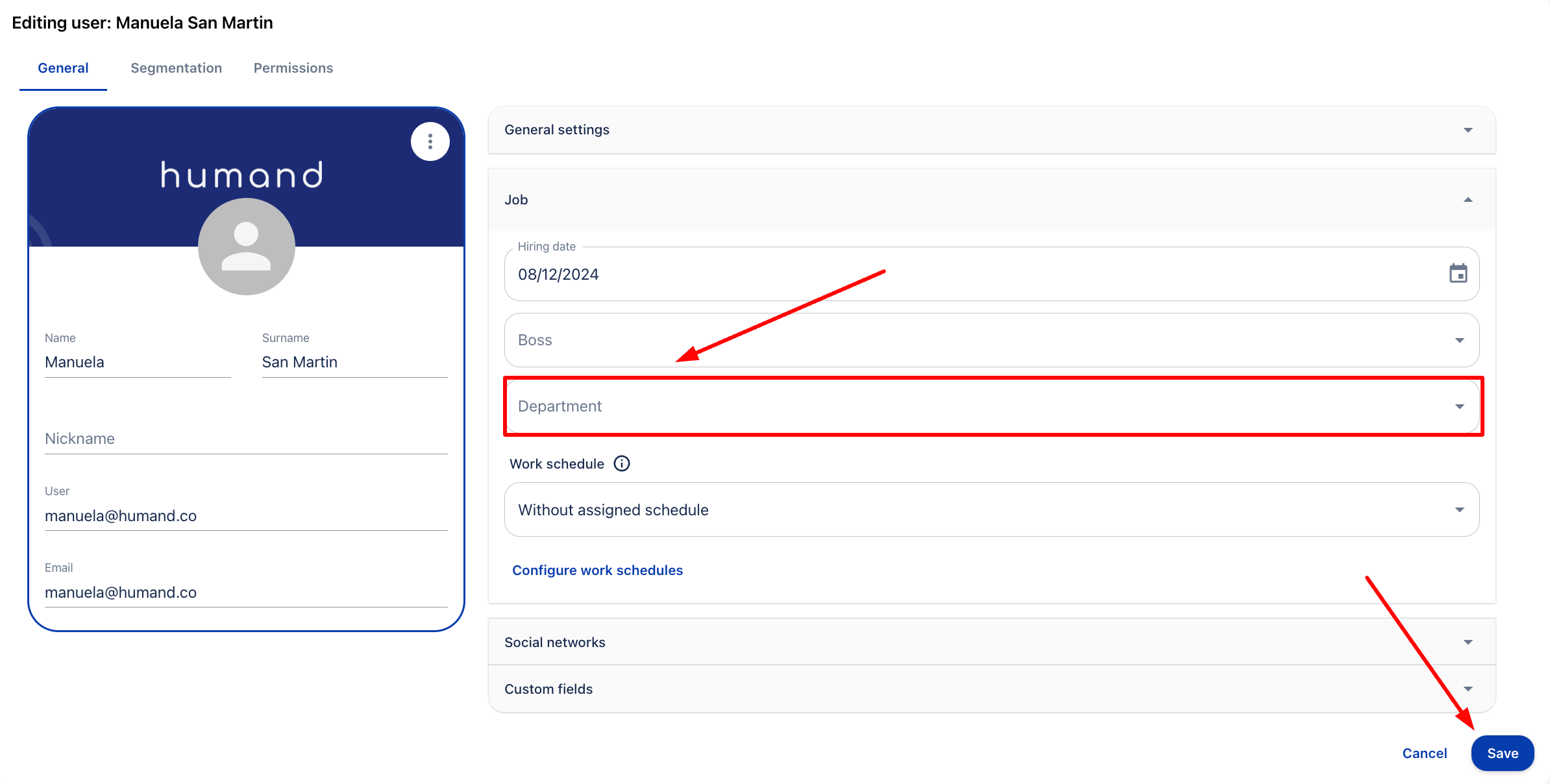 4. В секцията „Работа“ попълнете полето „Отдел“, като изберете една от предварително създадените опции. След това кликнете върху "Запази".