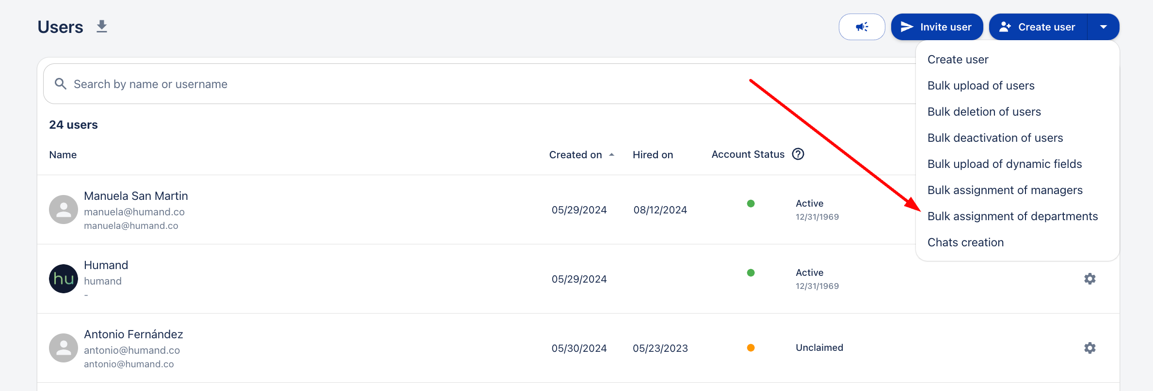 3. Кликнете върху бутона „Създаване на потребител“, след което изберете опцията „Масово присвояване на отдели“.