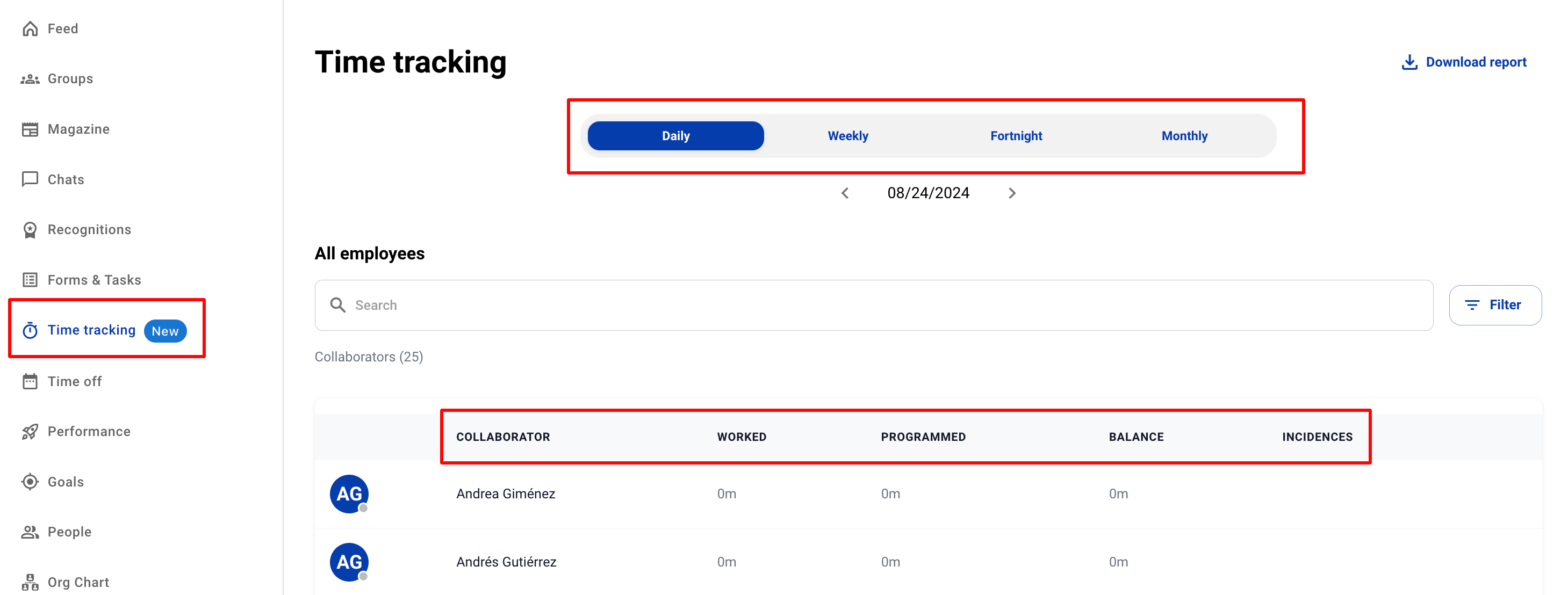 След като сътрудниците започнат да следят работните си часове, тези записи могат да бъдат преглеждани в секцията Проследяване на времето на Humand App.