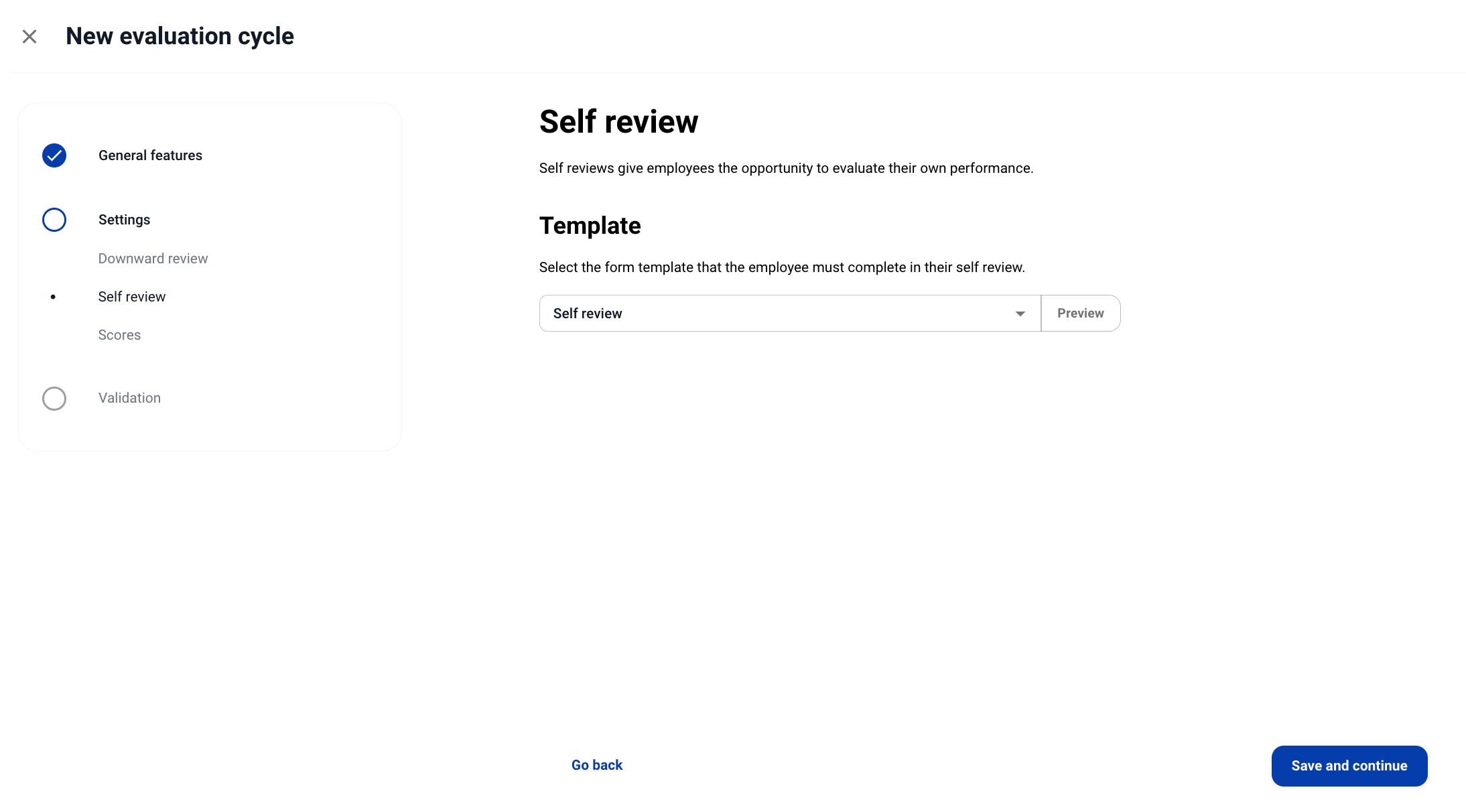 Ако преди това сте добавили самооценка към цикъла, за да могат сътрудниците да оценят своето представяне, трябва да изберете шаблон на формуляр, който ще използват за попълване. -