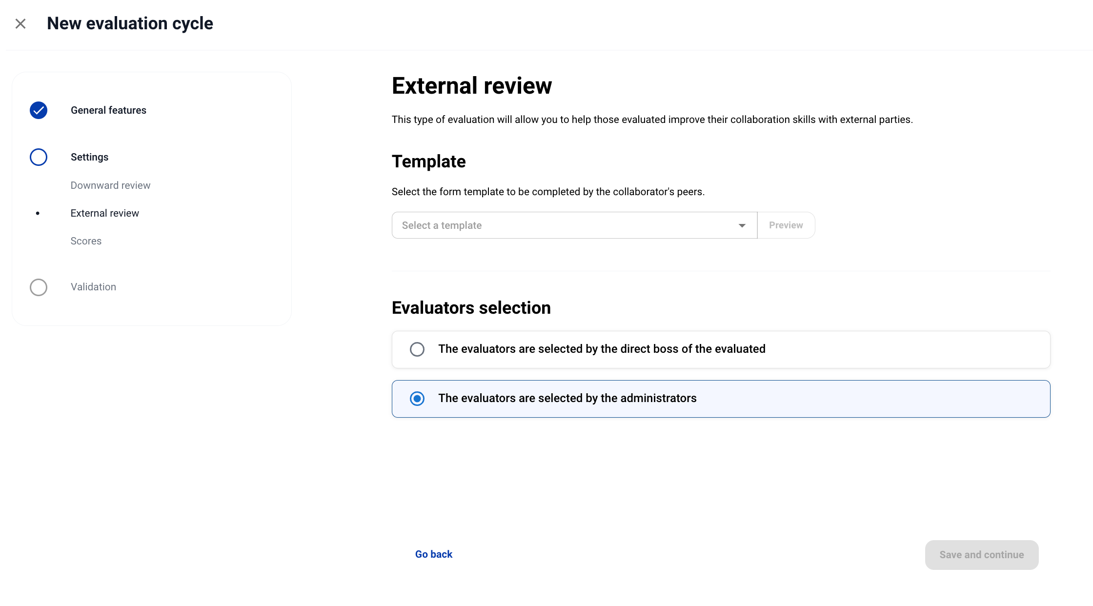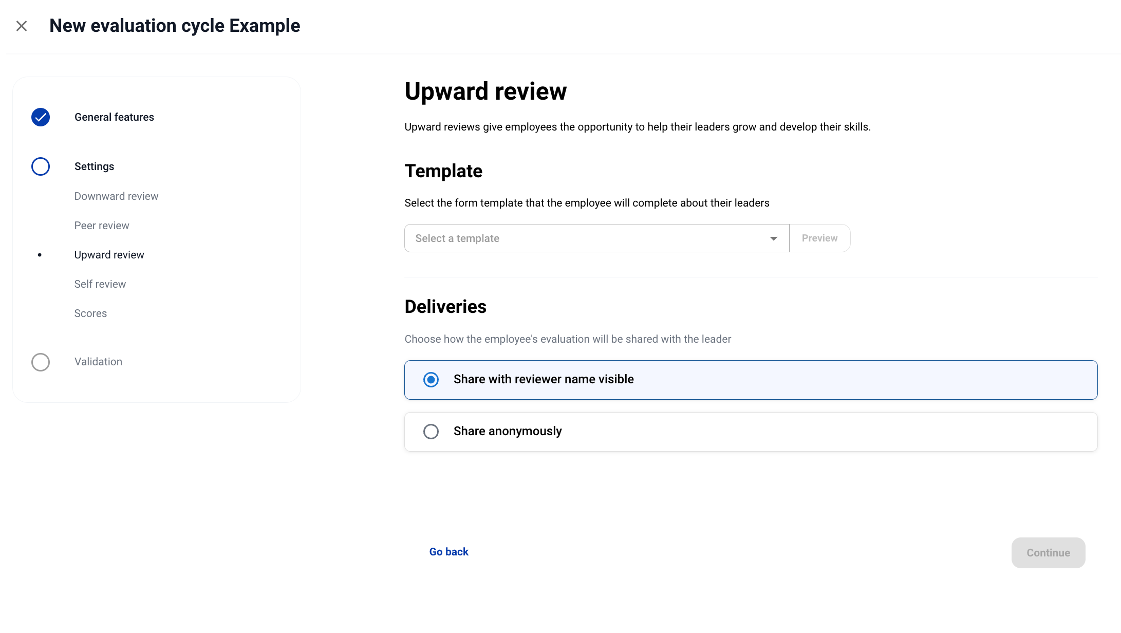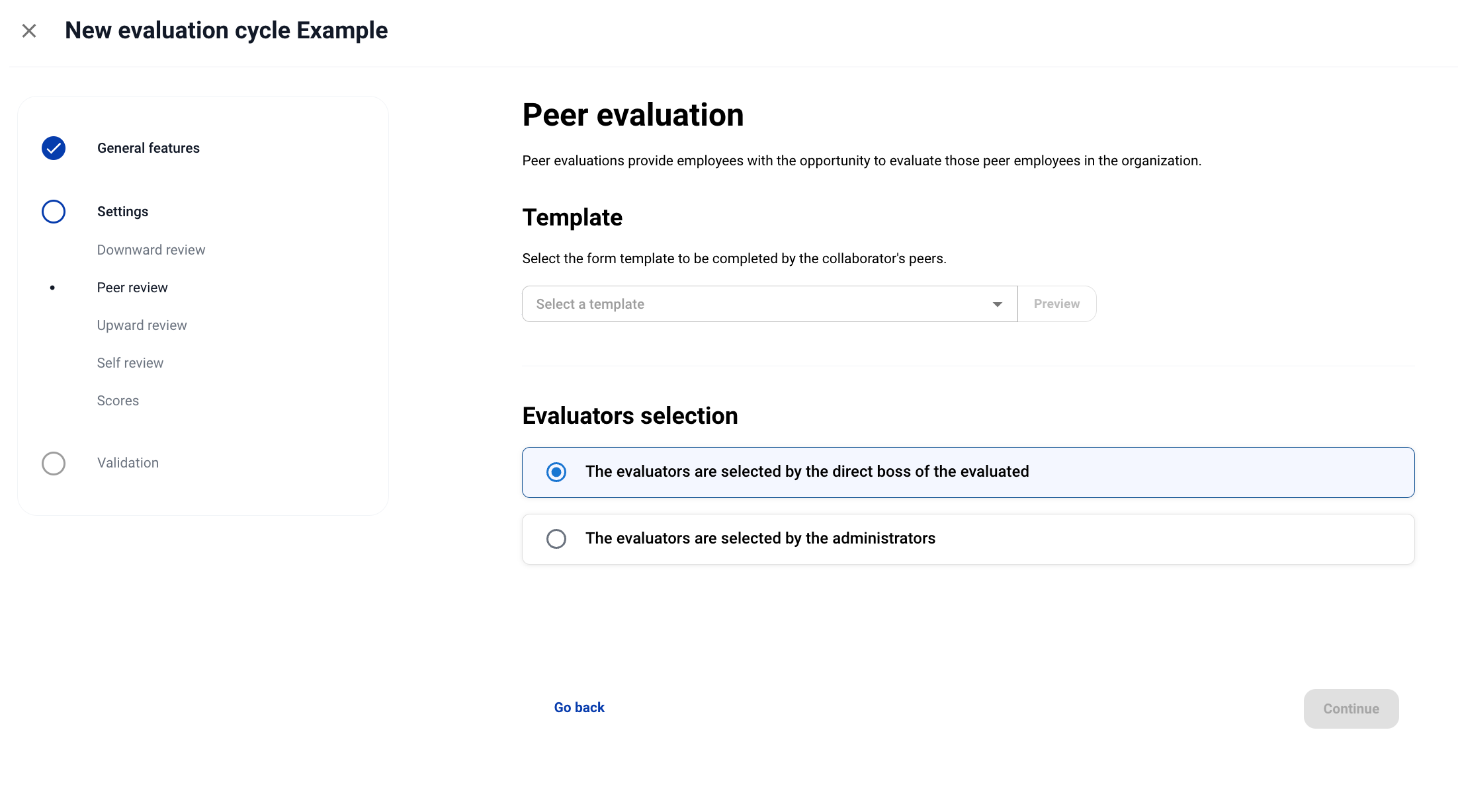 1. Изберете шаблон на формуляр, който да бъде попълнен от директния мениджър на сътрудника. Ако не виждате шаблон за избор, това е защото все още не сте създали такъв. За да го направите, отидете в раздела с шаблони в модула Performance.