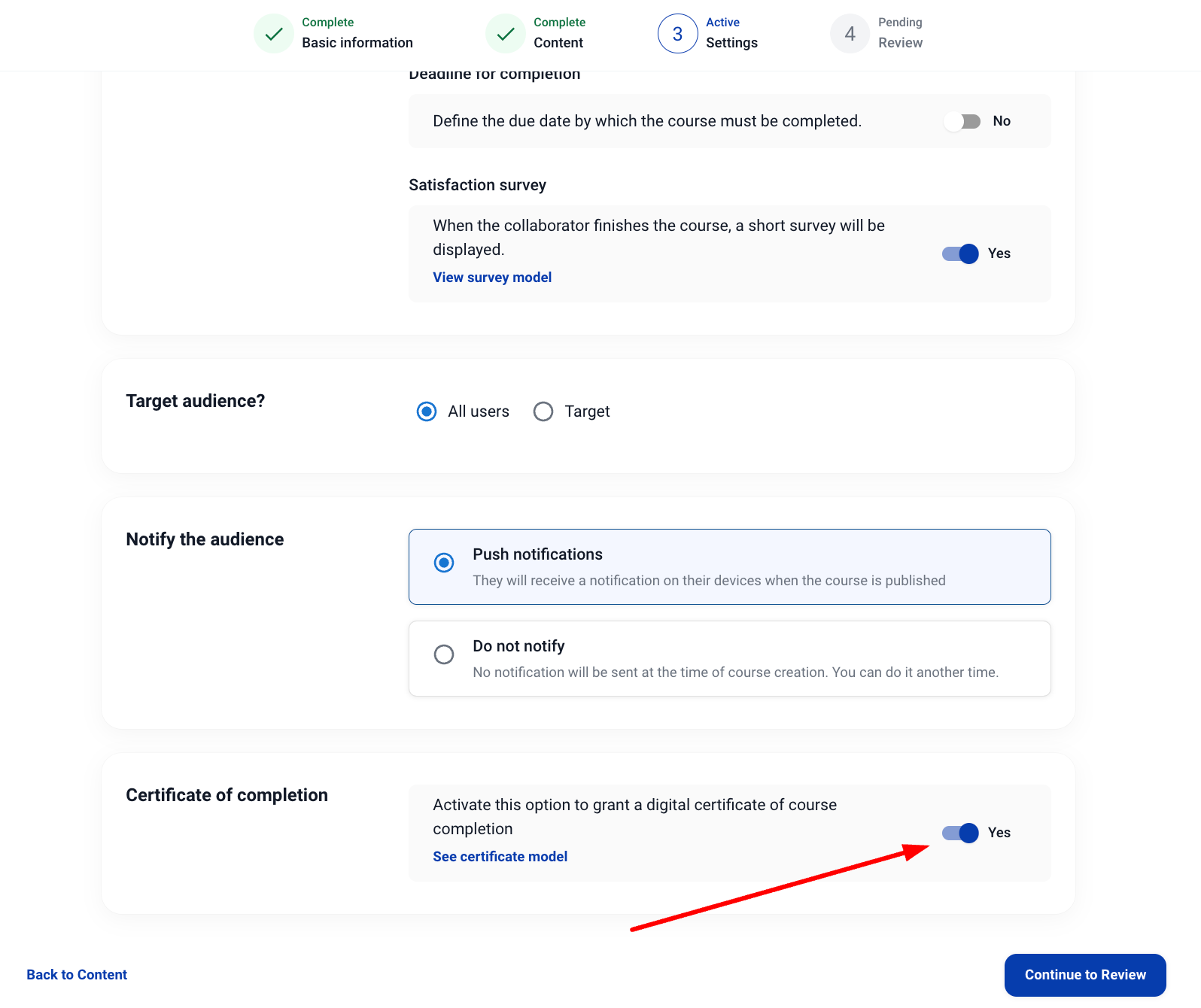 4. И в двата случая трябва да отидем в секцията Настройки на курса. Тук ще видим опцията „Сертификат за завършване“, трябва да я включите и да кликнете върху „Продължи към преглед“.