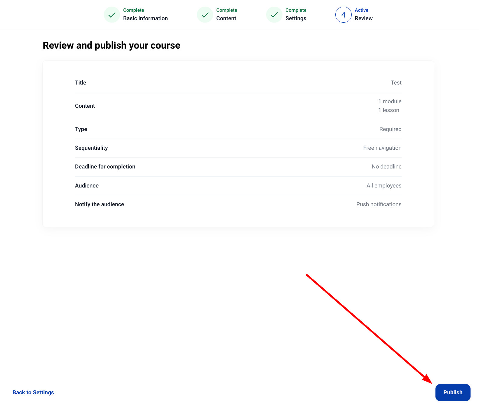 5. Накрая, прегледайте детайлите на вашия курс и кликнете върху „Публикувай“.