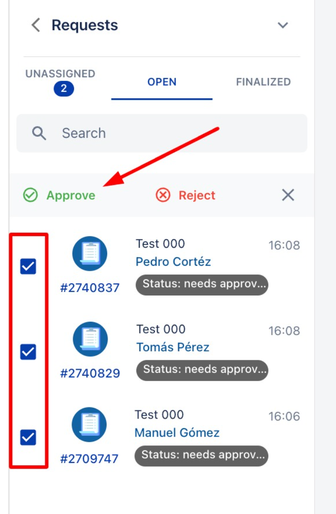 3. След като заявките са назначени и са в секцията Отворени, трябва да кликнете върху стрелката, където пише „Заявки“ и да изберете Избор на няколко.